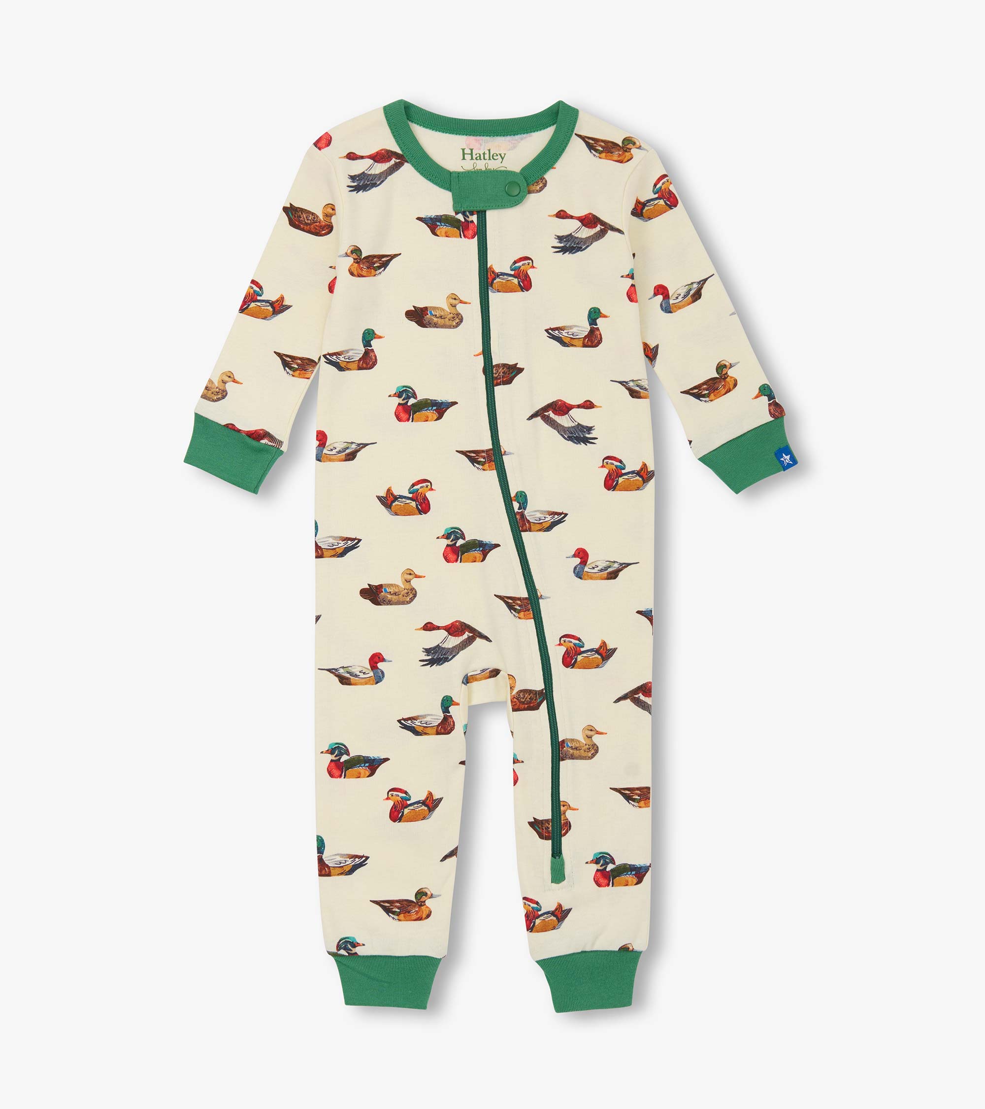 The Baby Boys Duck Decoys Cotton Sleeper in Cream is crafted from 100% soft cotton for ultimate comfort and breathability. This footless, tight-fitting coverall features a playful all-over pattern of colourful ducks on a cream background. A darker green front zipper runs from ankle to neck with a snap at the top for easy changing and an inside zipper guard for added safety. There are cuffs at the wrists, ankles, and legs to ensure a snug, cozy fit.