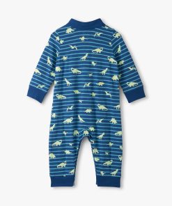 Let his dino dreams shine day and night in the Baby Boys Glow in the Dark Mini Dino Polo Romper in Blue. Crafted from 100% cotton jersey, this full-length romper features an all-over dinosaur silhouette print that glows in the dark, adding fun to bedtime and playtime alike. Thoughtful details like a wood-toned four-button polo neckline, hidden inner-leg snap closure, and contrasting collar, cuffs, and stripes make this a stylish yet practical pick.
