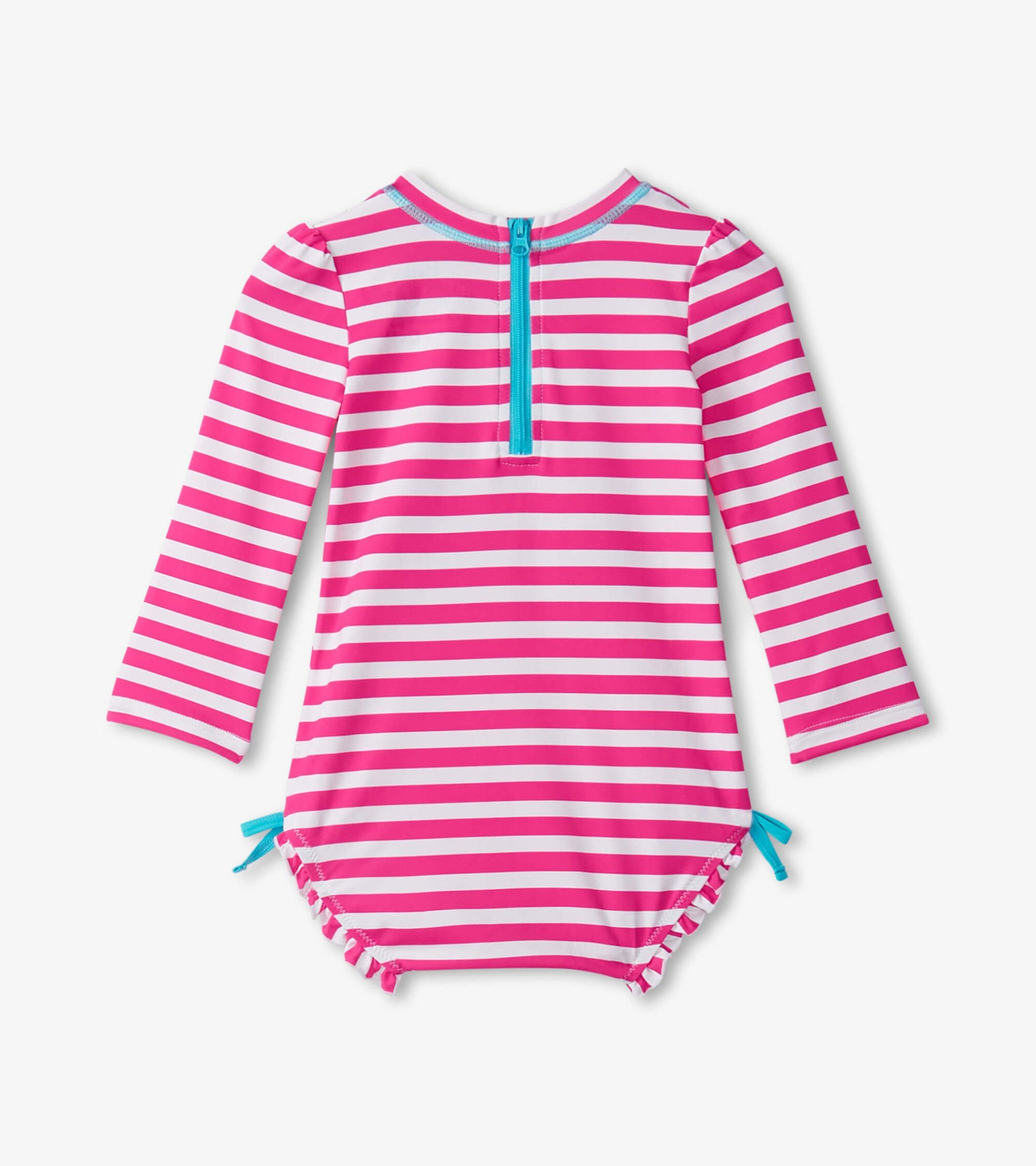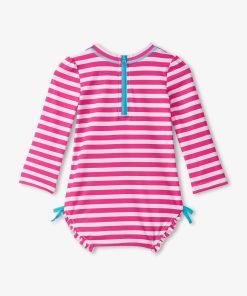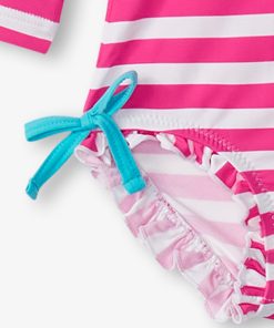 Sweeten the swim with our Baby Girls Candy Stripes Rashguard Swimsuit. The nylon and spandex blend is designed for ultimate comfort while shielding your little one from the sun. Featuring a playful striped design guaranteed to get them excited about aquatic adventures.