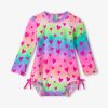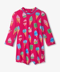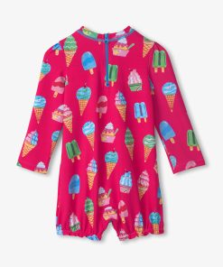 Cool off with our baby girls ice cream treats rashguard swimsuit! This fuchsia purple swimsuit features a fun multicolor ice cream treat design, cinched leg openings, a snap bottom closure, blue stitching around the neck, and a zipper on the back. Perfect for keeping your baby looking as sweet as the treat they truly are!