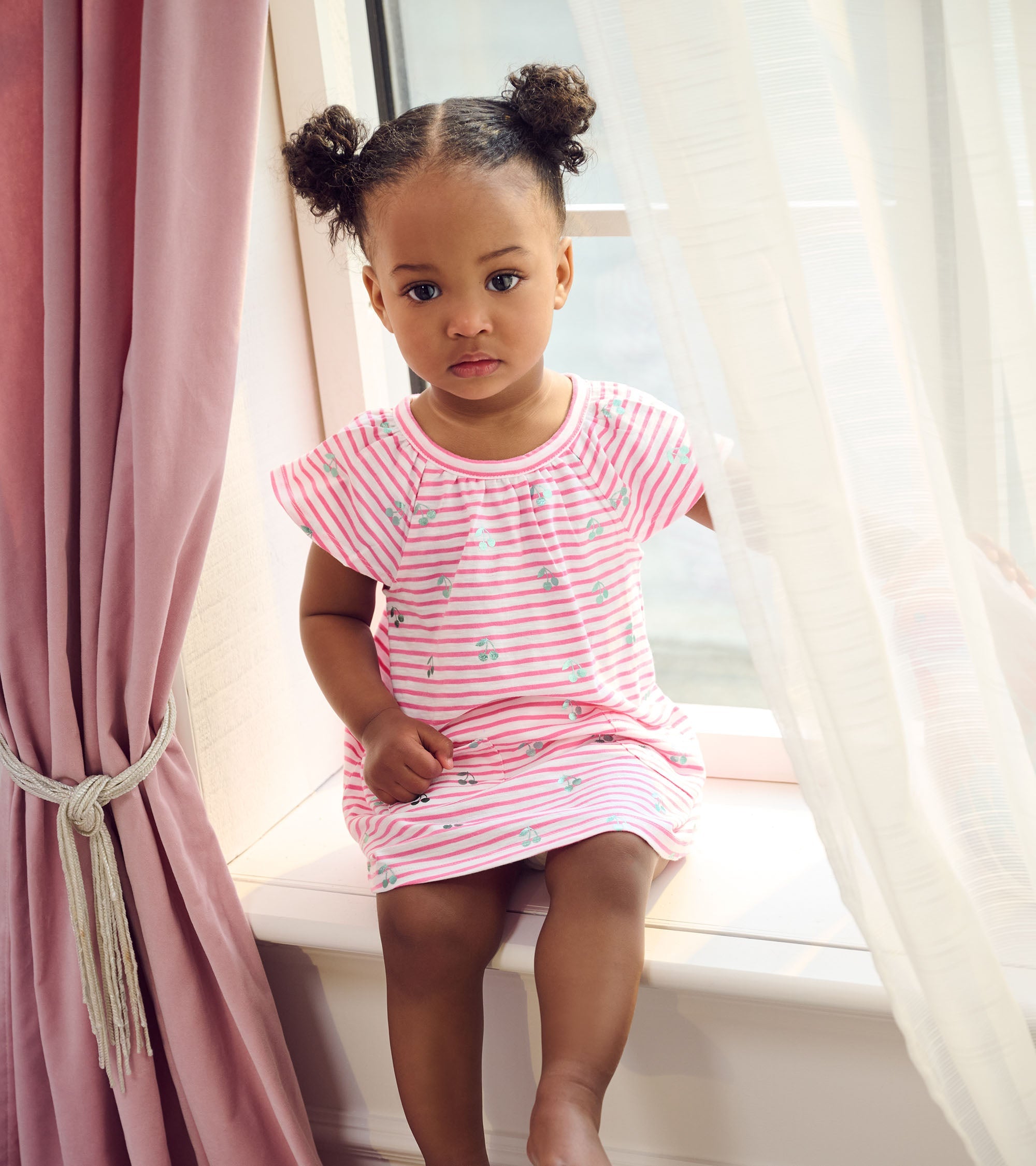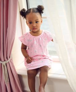 The Baby & Toddler Girls Cherry Stripes Easy Raglan Dress is perfect for carefree days! Made from soft cotton, this dress features charming cherry stripes and a relaxed raglan design for all-day comfort. Its lightweight fabric makes it ideal for warm weather, whether she’s at the park or a family picnic. Pair it with sandals for an adorable, easy-to-wear look.