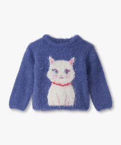 Cozy meets cute in the Baby & Toddler Girls Kitty Cat Furry Sweater in Blue! Made from a super soft and stretchy hairy nylon blend, this fuzzy long-sleeve sweater keeps her warm and comfy all day. The round neckline and plush texture offer an extra snuggly feel, while the charming design, a large white kitty knitted into the front with a fuchsia collar, turquoise and purple eyes, and pink whiskers, adds playful personality. Set against a soothing blue background, it’s a purr-fect piece for chilly weather with just the right mix of fun and flair.