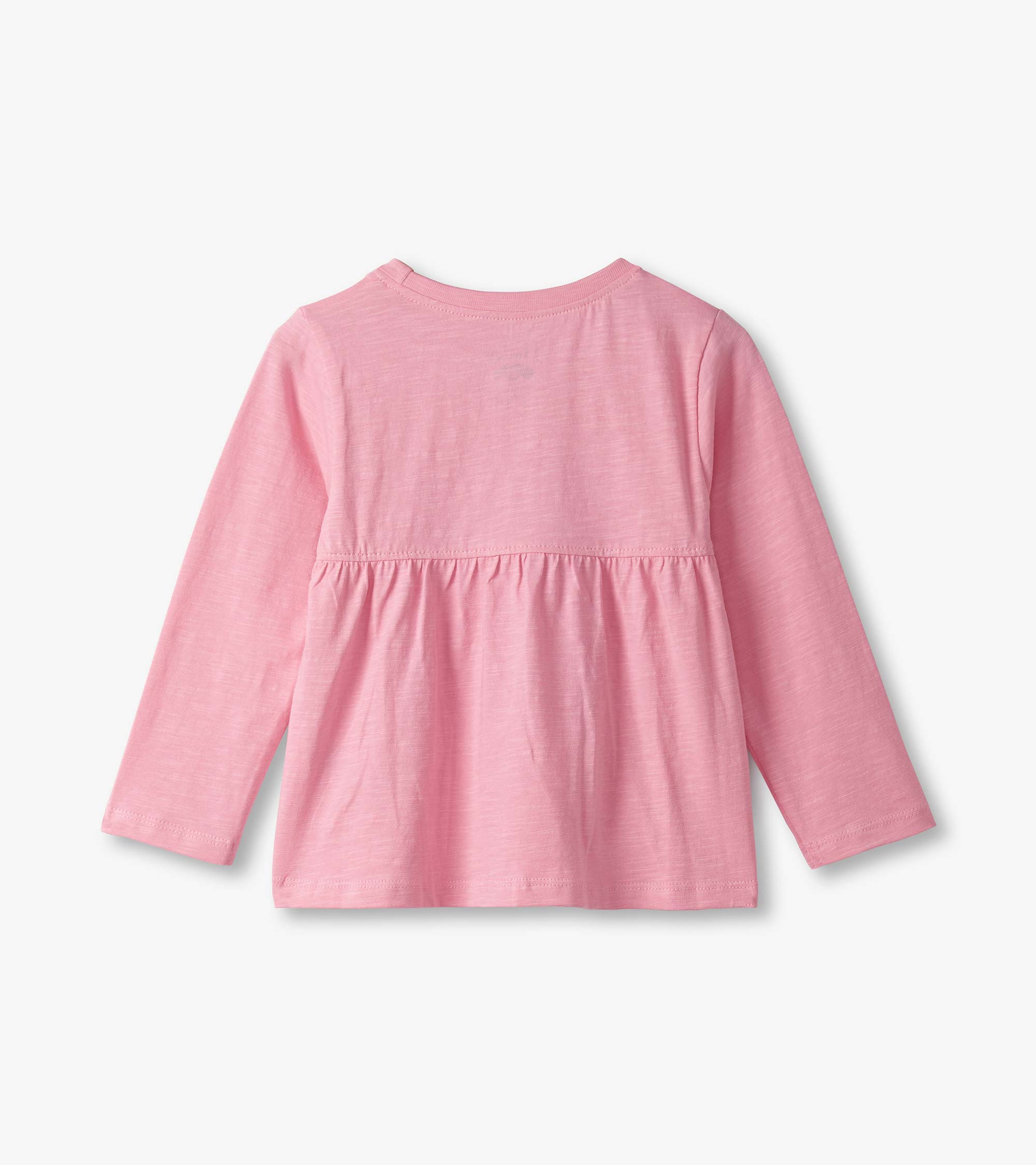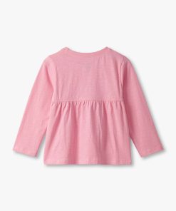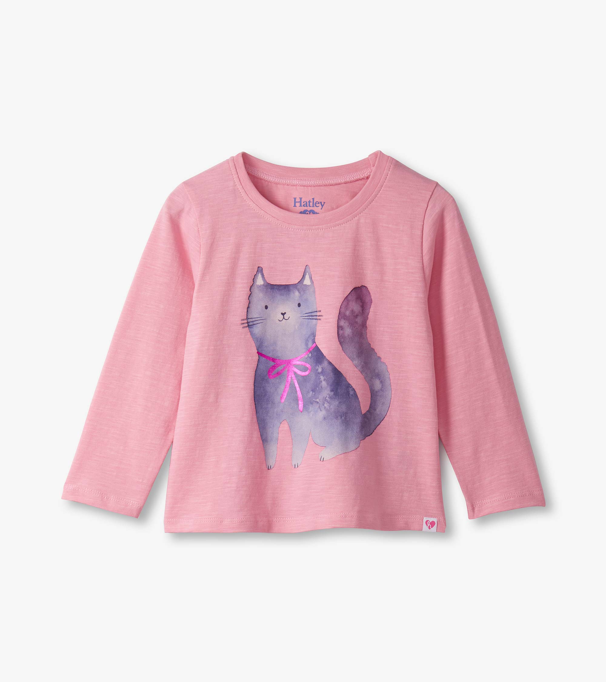 Bring playful charm to her everyday wardrobe with the Baby & Toddler Girls Kitty T-Shirt and Legging Set in Pink! This sweet set features a heathered pink long-sleeve crew neck tee with a gathered empire seam at the back for a gentle, flowy fit. The front showcases a large watercolour-style graphic of a purple and white cat wearing a fuchsia ribbon, perfect for little animal lovers. Coordinating white and blue horizontal striped leggings offer all-day comfort with a soft, stretchy cotton blend and a snug elastic waistband.
