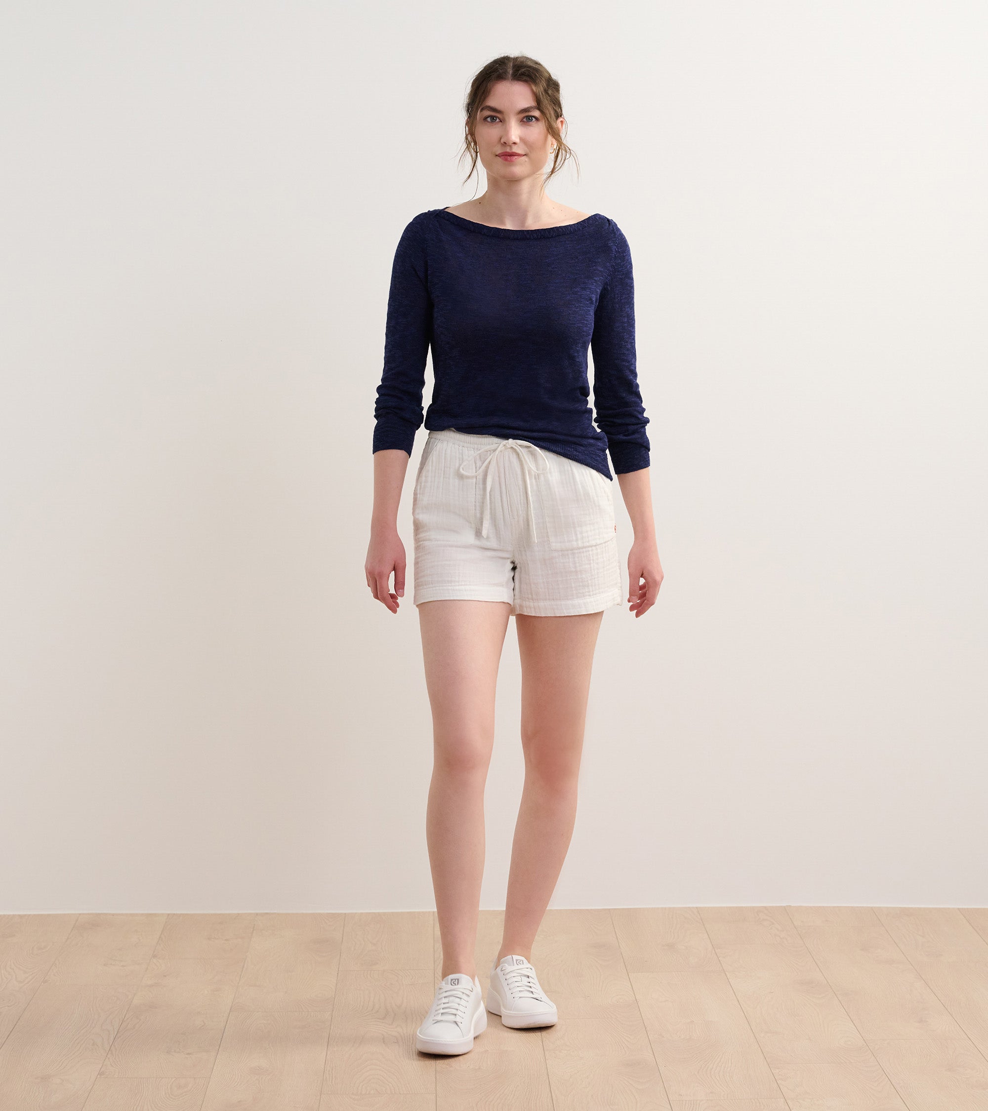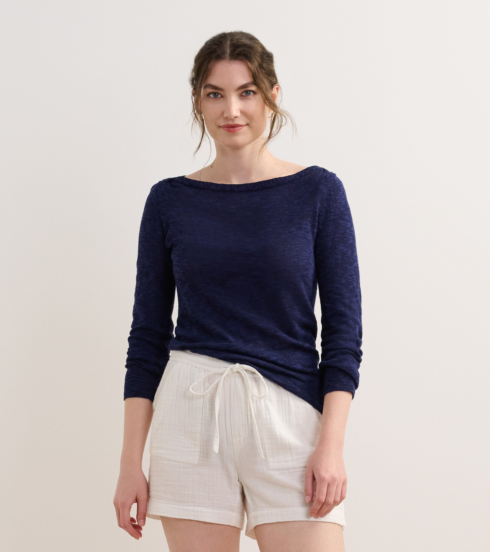Our 3/4 Sleeve Knit Breton in Navy is a harmonious blend of traditional style and modern comfort. The mix of cotton and viscose offers a soft touch and a gentle stretch, perfect for a refined yet relaxed fit. The 3/4 sleeves add a touch of transitional elegance, suitable for both crisp mornings and warm afternoons.
