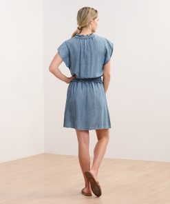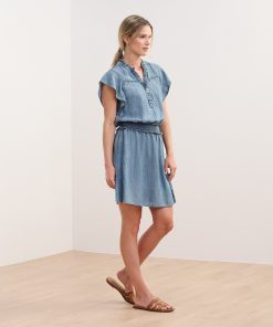 The Ava Dress in Blue Acid Wash brings a contemporary edge to feminine styling. Made from silky lyocell, it offers a smocked waist, ruffle cap sleeves, pretty ladder embroidery, a lightweight feel and a flattering silhouette. The acid wash finish adds a touch of casual sophistication. Perfect for day-to-night wear, it pairs beautifully with both flats and heels.