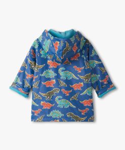 Make a splash in dino style with this vibrant rain jacket, set against a bold blue backdrop and brought to life with an all-over print of roaring blue, yellow, orange, and green dinosaurs. With soft light blue lining for comfort, it features a matching light blue snap button front, raglan sleeves, and front patch pockets with flaps to stash tiny treasures. Built with a 100% polyester shell and PU coating, it’s made to withstand all their wet-weather adventures.
