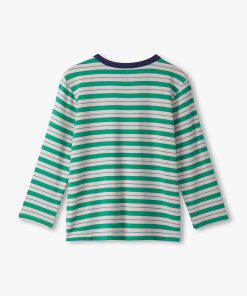The Boys Blarney Stripes Long Sleeve Bamboo T-Shirt in Green is a stylish essential made from a soft, eco-friendly bamboo blend that keeps kids cool and comfortable all day. Featuring a refreshing green background accented with beige and thin blue stripes, this shirt stands out with a dark blue crewneck and matching patch pocket on the chest.