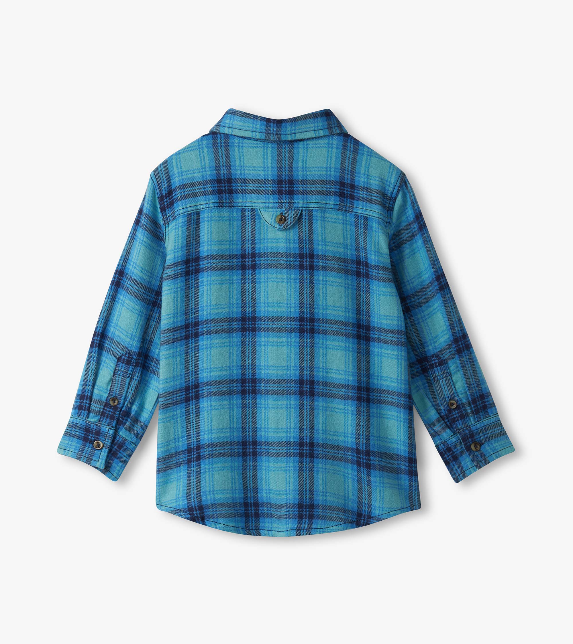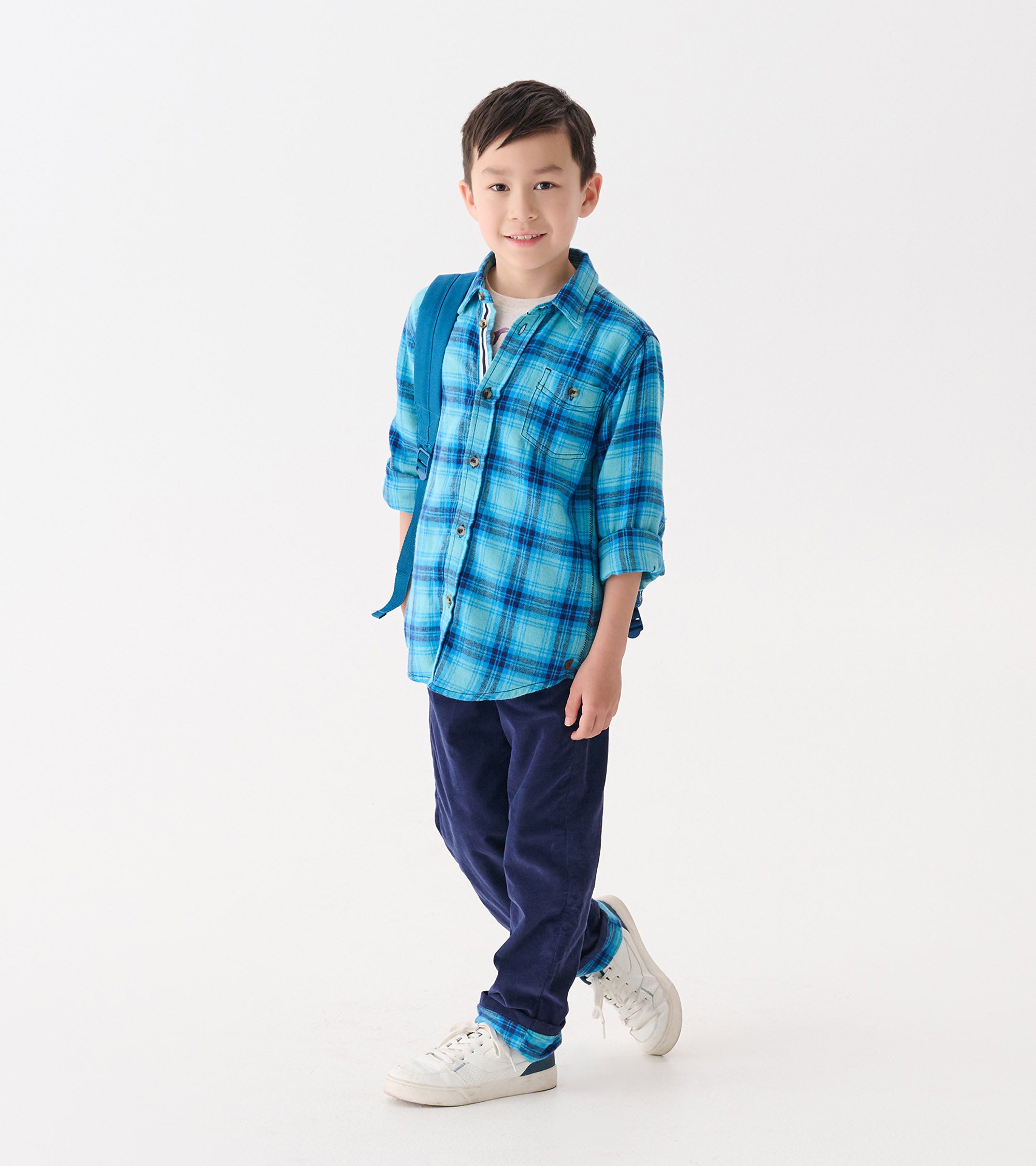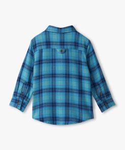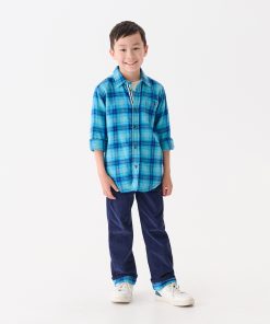 Introduce effortless cool to his wardrobe with the Boys Blue Stone Plaid Button Down Shirt in Blue. Crafted from soft, 100% cotton twill brushed plaid, this long-sleeve shirt blends comfort with classic style. The light and dark blue check pattern delivers timeless appeal, while contrast buttons along the front and chest pocket add a modern touch. Whether he’s dressing up or down, it’s the perfect layer for laid-back polish.