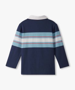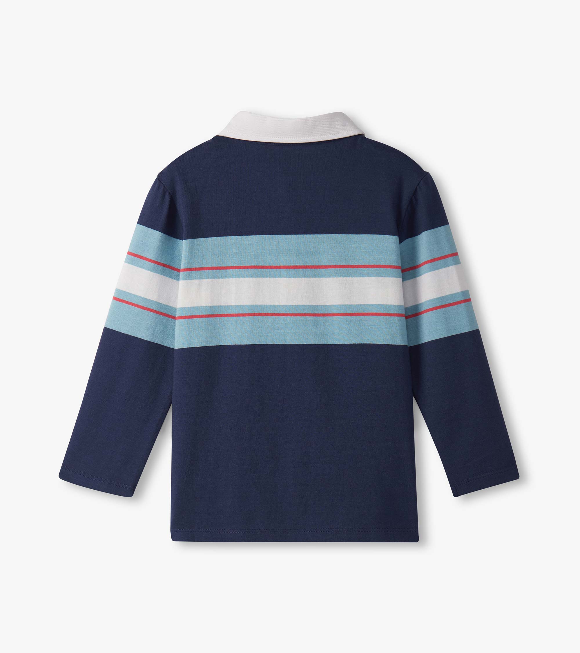 The Boys Blue Stripes Rugby Polo in Blue is made from 100% cotton peached jersey, offering a soft, breathable feel ideal for everyday wear. With a crisp white two-piece collar and a classic three-button placket extending from chest to neck, this long-sleeve polo stands out with bold white, light blue, and red stripes across the chest and arms. The staggered hem with side slits allows for comfortable movement.