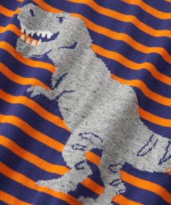 Bring prehistoric flair to everyday comfort with the Boys Dino Mixed Stripes Raglan Sweater in Blue! Made from 100% cotton yarn, this soft and breathable knit sweater showcases a playful grey T. rex boldly knitted into the torso, set against a dark blue background with vibrant orange stripes. The lighter blue raglan sleeves add a fun contrast with their stripe pattern, while the elastic cuffed crewneck, wrists, and hem ensure a snug, stay-put fit for active little explorers.