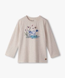 Celebrate outdoor adventures with the Boys Hunting Dogs Long Sleeve Graphic Tee! Made from 100% cotton, this heathered tan t-shirt features a striking chest graphic of a loyal hunting dog mid-search in a watery wildscape, with birds overhead.