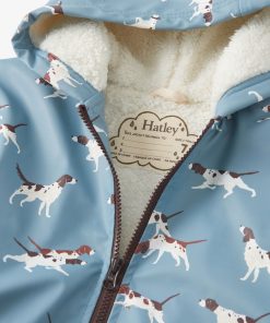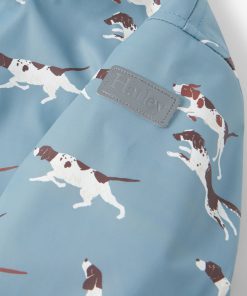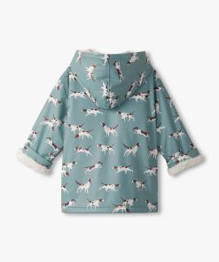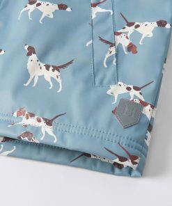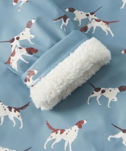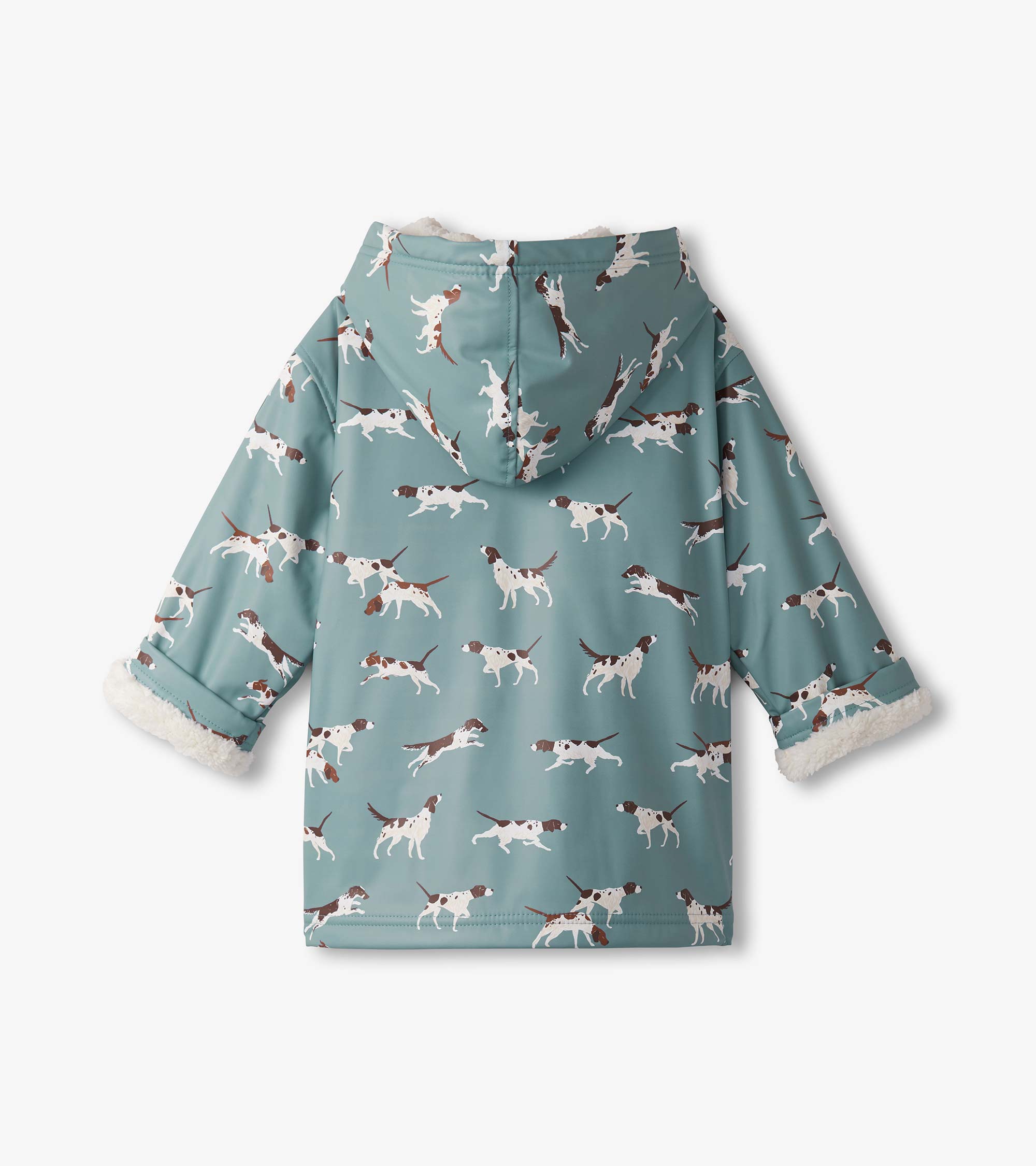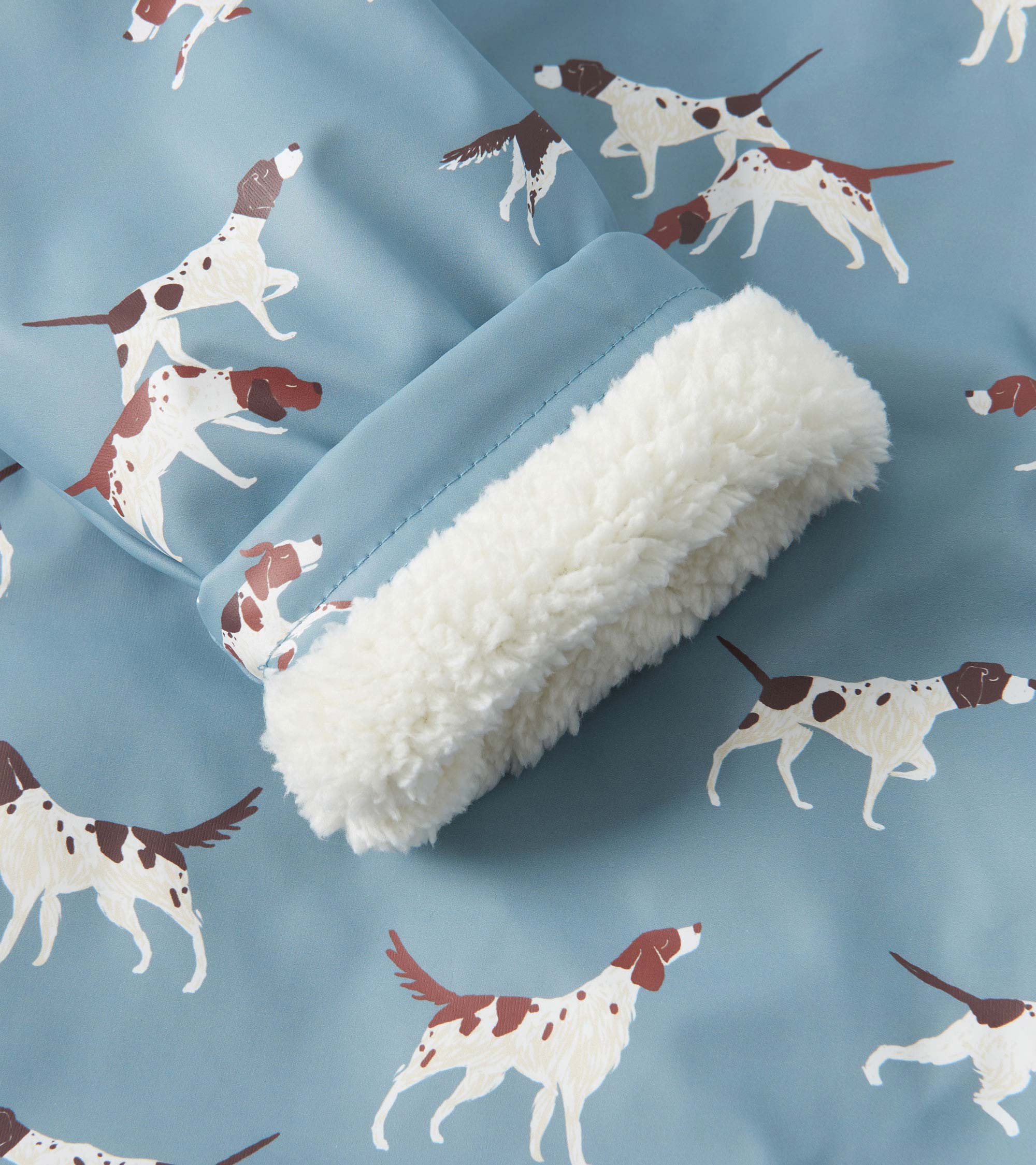 The Boys Hunting Dogs Sherpa Lined Zip-Up Rain Jacket in Blue brings cozy warmth and rugged charm to wet-weather days. Set against a muted teal backdrop, playful prints of light and dark brown hunting dogs capture the spirit of the outdoors in motion. The jacket’s PU-coated polyester shell shields from rain, while the plush faux Sherpa lining and fully lined hood provide toasty comfort. A dark brown exposed zipper and front welt pockets add functional flair, and thoughtful touches like a name label for up to three names make passing it down easy.