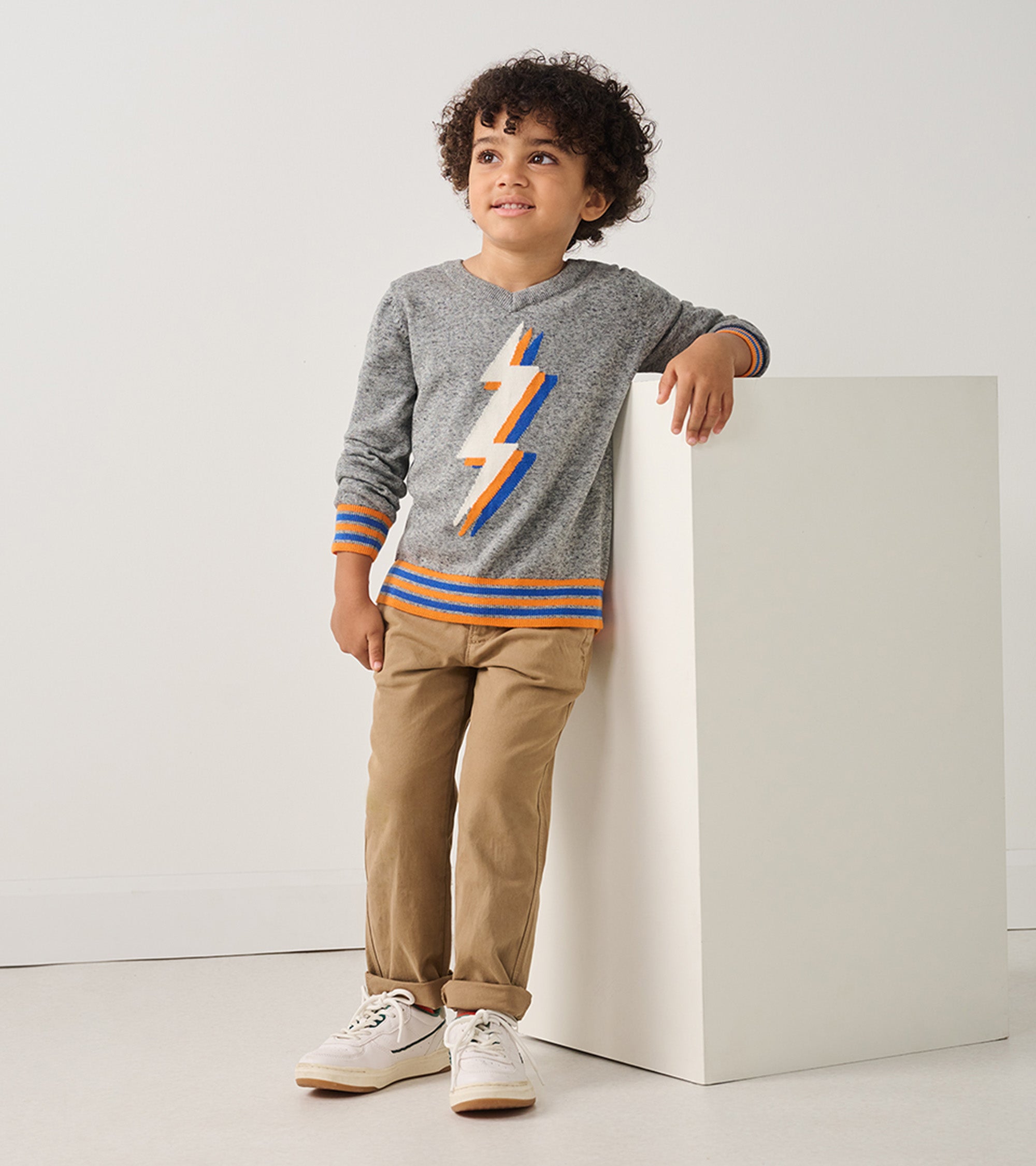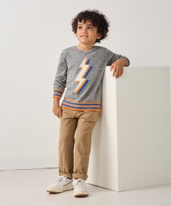 The Boys Lightning Bolt V-Neck Sweater is a stylish way to keep your little one warm. Made from soft cotton, this sweater features a bold lightning bolt design that adds a touch of excitement to any outfit.