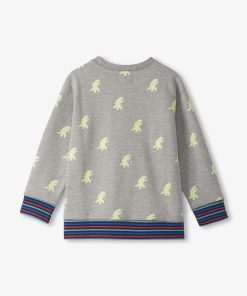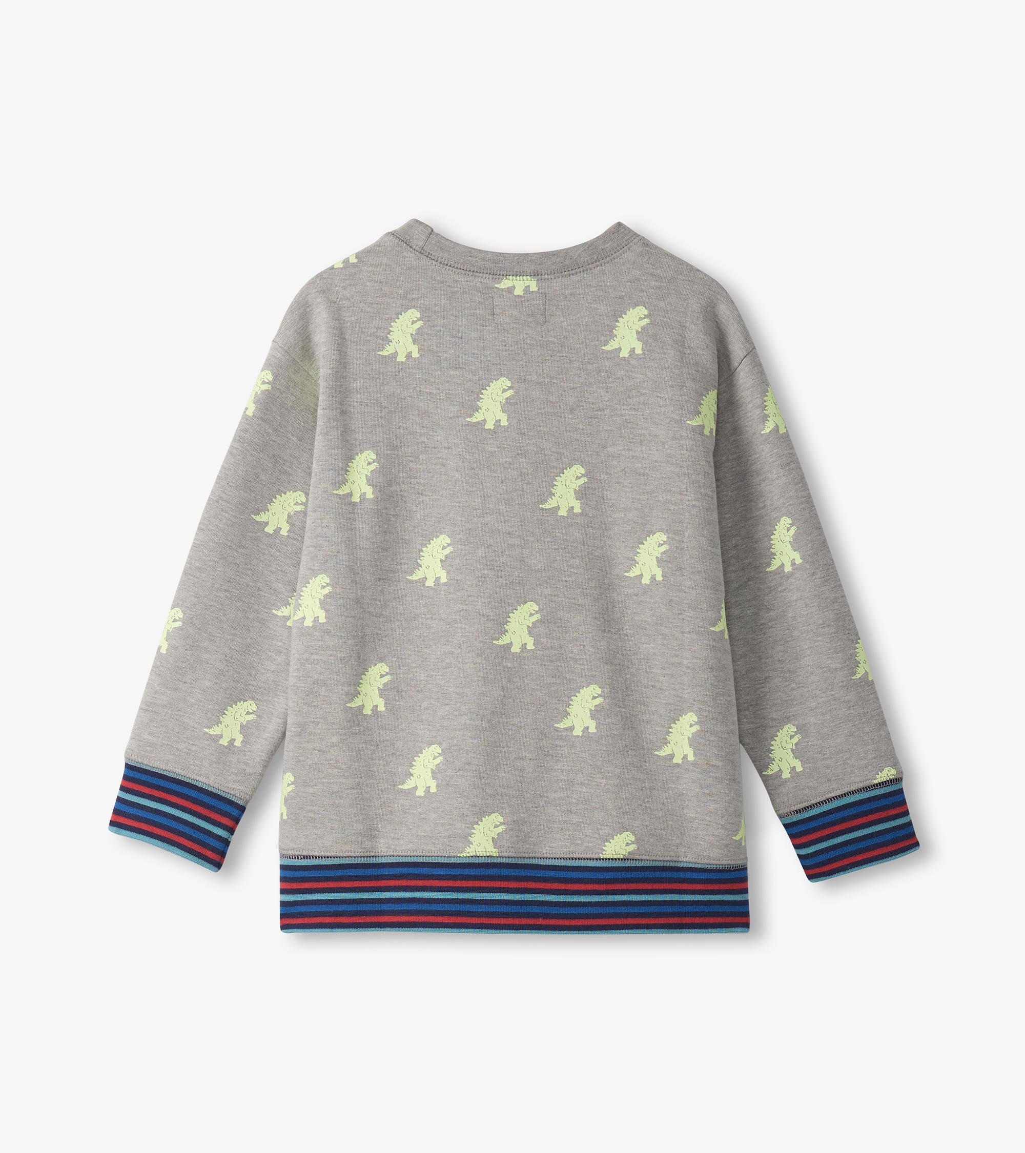 The Boys Monster Pullover Sweatshirt in Grey is a combo of comfort and fun, perfect for little adventurers. Made from soft French terry, this crew neck sweatshirt features long sleeves, dropped shoulders, and a relaxed fit for all-day ease. Set against a heathered grey backdrop, it features an all-over glow-in-the-dark dinosaur print that lights up his imagination. Finishing touches like red, blue, and black striped elastic cuffs give this pullover an extra bite of bold style.