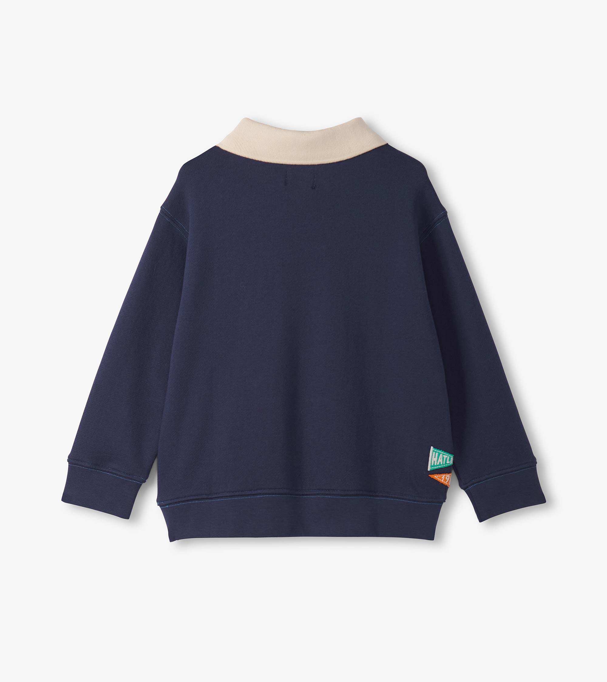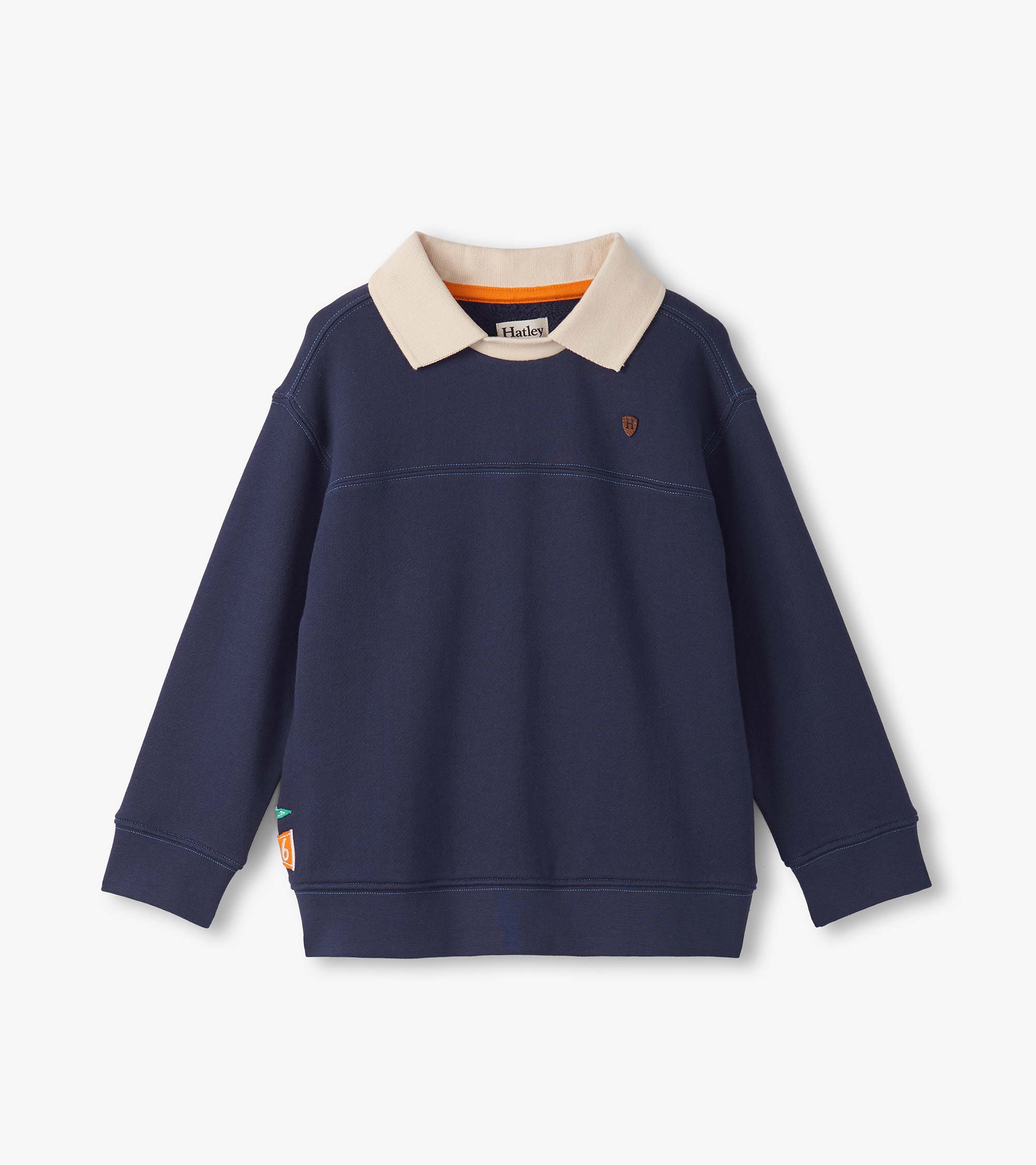 The Boys Patriot Blue Fooler Polo Pullover in Blue is a clever blend of polished style and cozy comfort. Made from 100% cotton washed loop French terry, this pullover sweatshirt features a rich dark blue body with a built-in white faux polo collar for a layered look, without the bulk. Thoughtful details like dropped shoulders, a round neckline, light blue seam stitching, and an upper chest style line create a modern, sporty vibe. Finished with ribbed cuffs and a cuffed hem, this piece effortlessly combines smart style with everyday wearability.