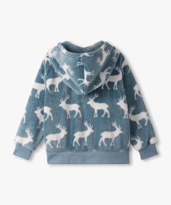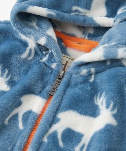 Wrap him in outdoor adventure with the Boys Staggered Elks Fuzzy Fleece Zip-Up Hoodie in Blue! Made from ultra-soft polyester fuzzy fleece, this warm hoodie features a greyish blue base with an all-over white elk silhouette print. The front kangaroo pocket and bright orange exposed zipper add both function and flair, while elastic cuffs and hem ensure a snug, comfy fit for chilly outdoor play.