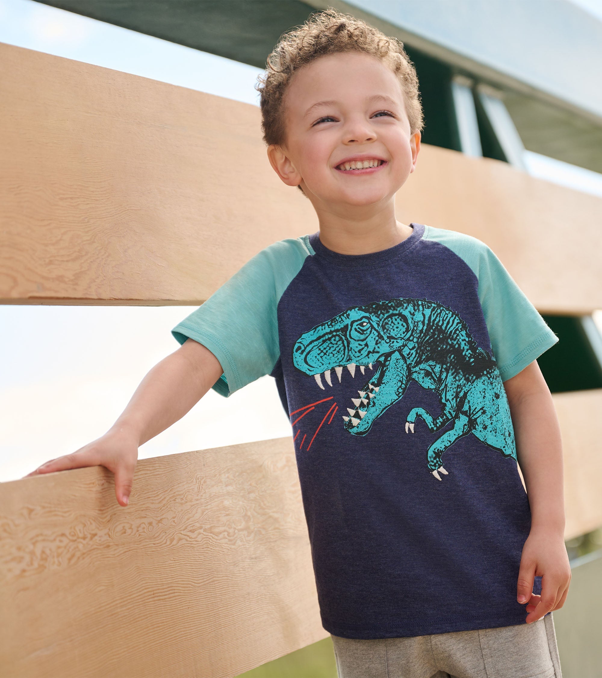 Let your little paleontologist roar in style with the Boys T-Rex Raglan T-Shirt! Made from a comfy cotton-polyester blend, this tee features bold T-Rex graphics that spark imagination. The raglan sleeve design adds a sporty touch, making it perfect for active play. Pair it with shorts or jeans for a dino-mite outfit!