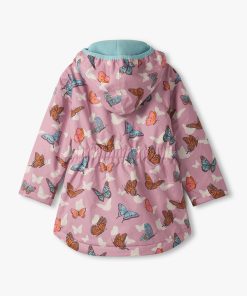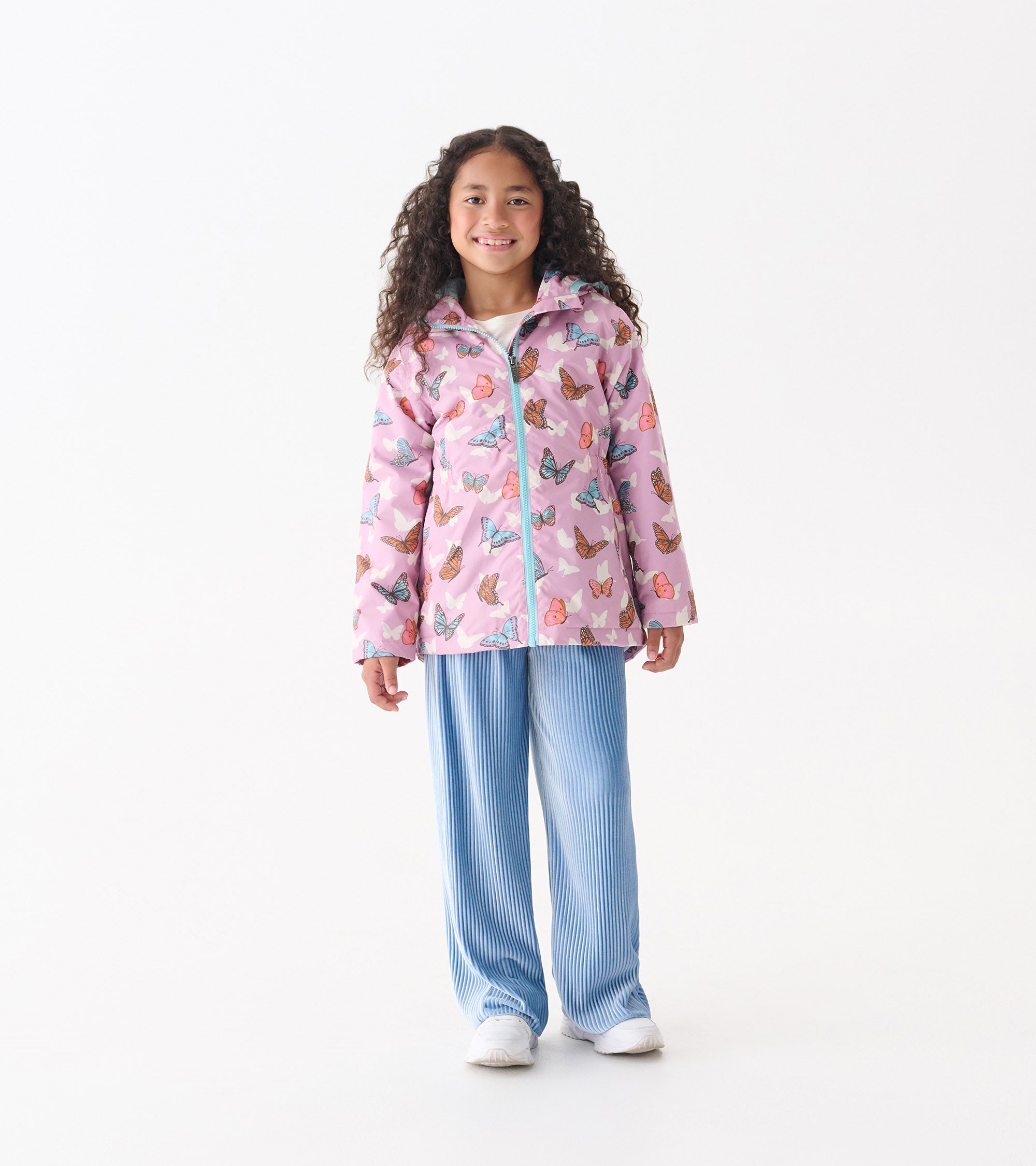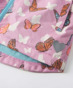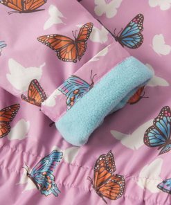 She’ll flutter through rainy weather with the Girls Pop-Out Butterflies Zip-Up Lightweight Rain Jacket in Pink! The dark pink shell is adorned with a cheerful print of white and multicoloured butterflies, while the baby blue fleece lining adds softness. Designed with an elasticated hood and waist, it’s as functional as it is fun.