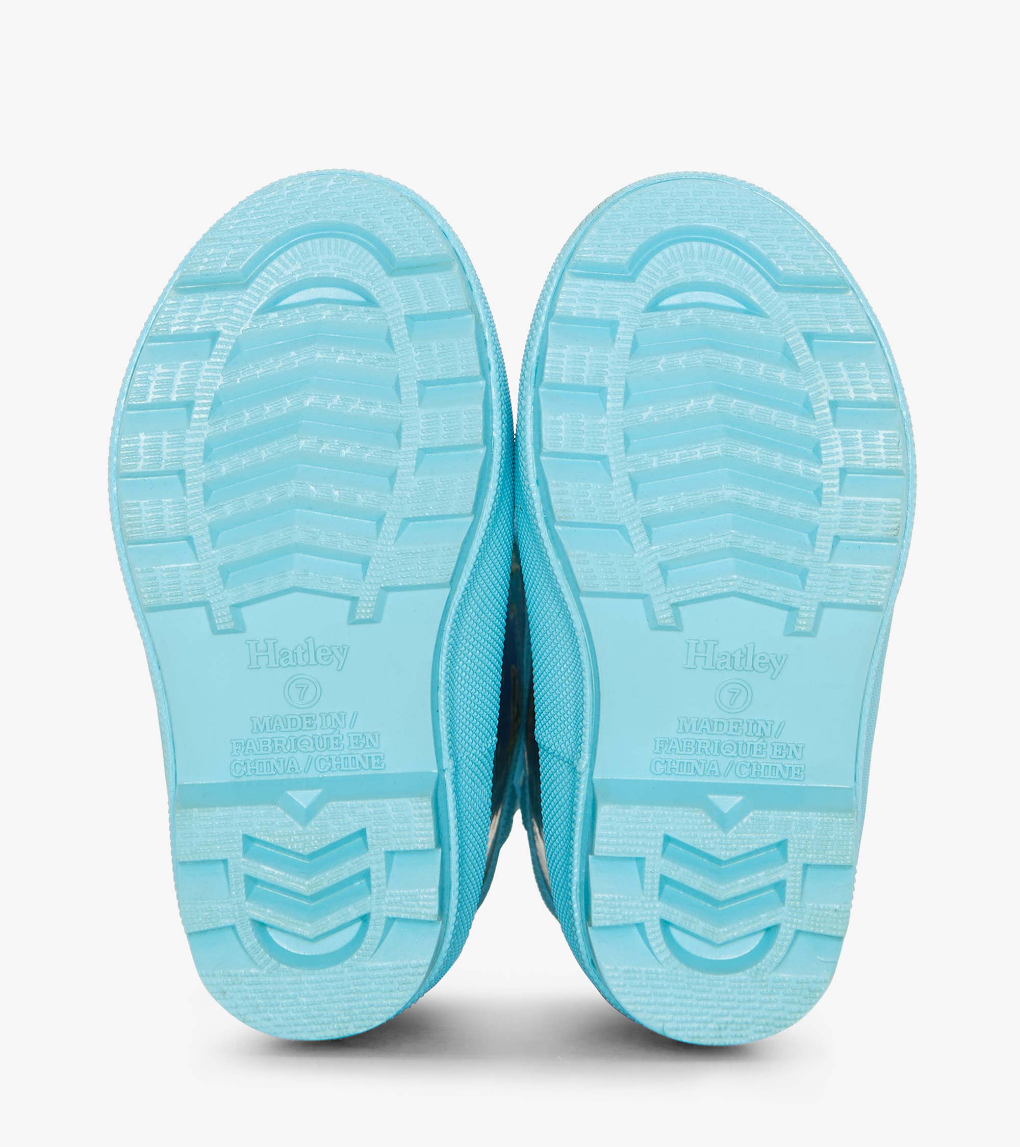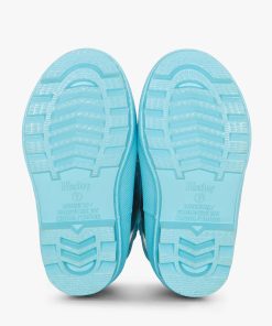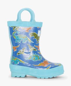 Stomp into rainy day fun with the Toddler Boys Dino Roar Rain Boots in Blue! Designed for mini explorers, these handmade vulcanized rubber boots are fully waterproof with slip-resistant soles that grip every step. The glossy blue exterior features a playful print of green, baby blue, and orange dinosaurs that roar with personality. A baby blue sole, striped accents up the back, rim, and boot loops bring bold contrast, while the white-and-baby blue front logo adds a cool branded touch. With a removable insole for added comfort, these boots make every splash a prehistoric adventure.