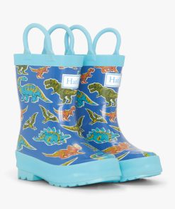 Stomp into rainy day fun with the Toddler Boys Dino Roar Rain Boots in Blue! Designed for mini explorers, these handmade vulcanized rubber boots are fully waterproof with slip-resistant soles that grip every step. The glossy blue exterior features a playful print of green, baby blue, and orange dinosaurs that roar with personality. A baby blue sole, striped accents up the back, rim, and boot loops bring bold contrast, while the white-and-baby blue front logo adds a cool branded touch. With a removable insole for added comfort, these boots make every splash a prehistoric adventure.
