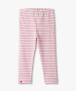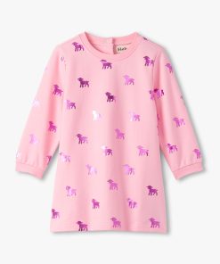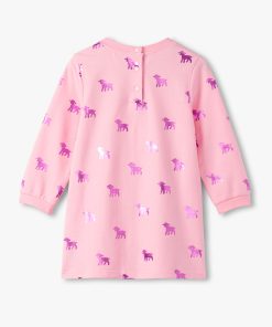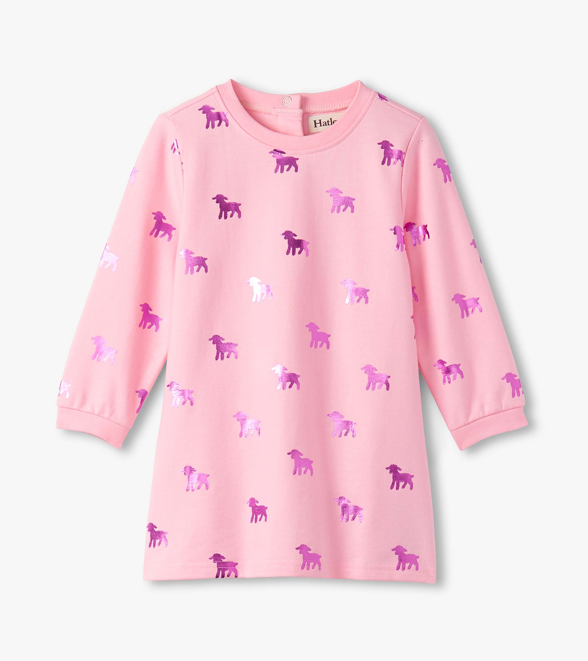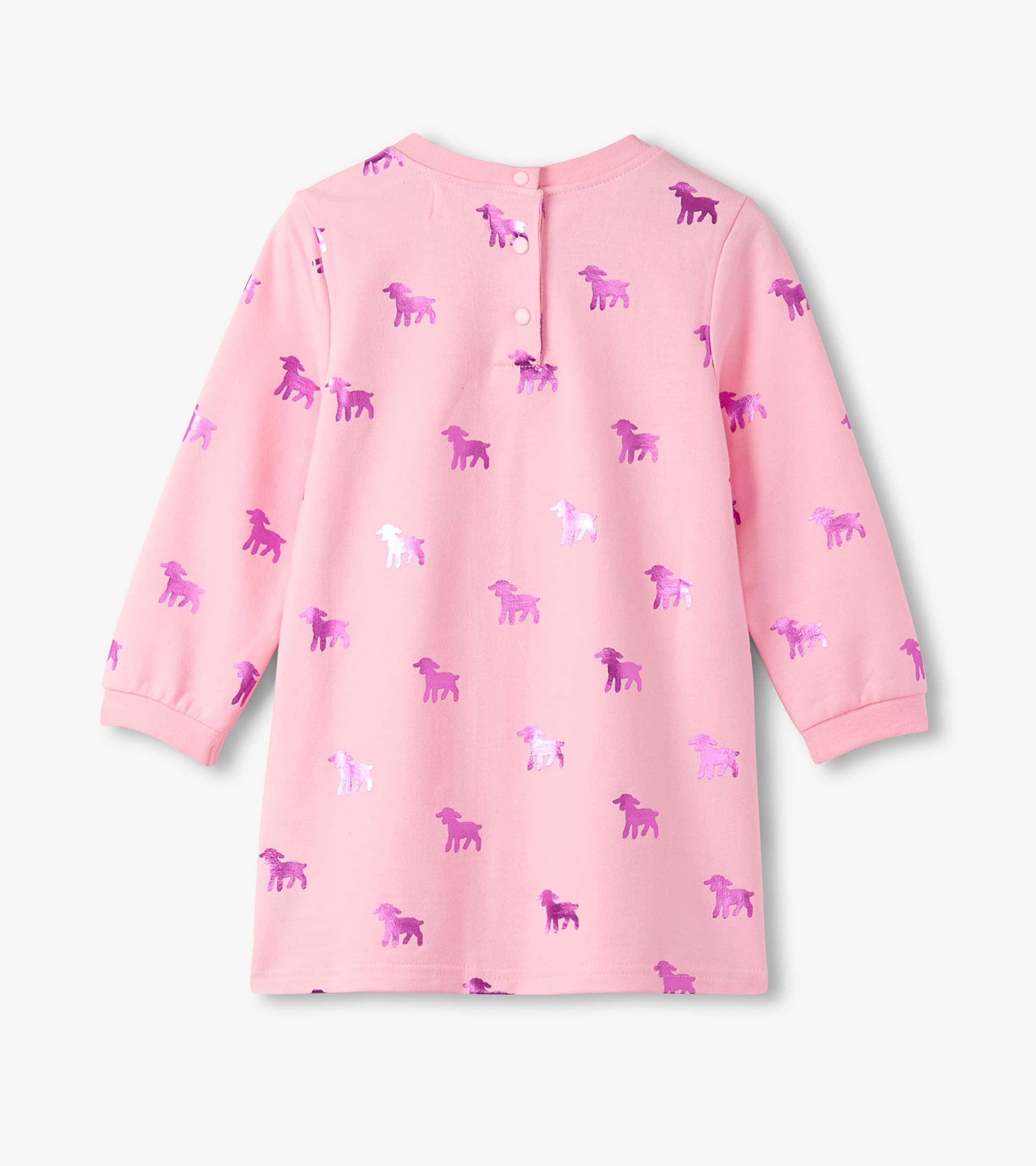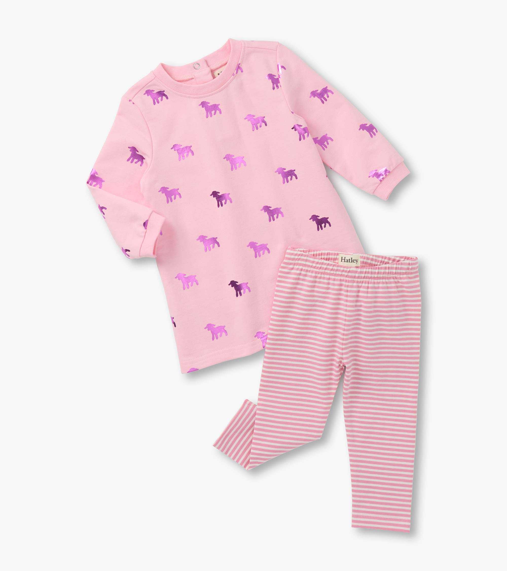 Add a touch of shimmer to her everyday adventures with the Baby & Toddler Girls Lamb Silhouette Dress and Legging Set in Pink! This charming set includes a heathered pink long-sleeve dress-style top featuring a classic crew neck, cuffed wrists, a gathered empire seam at the back, and a two-button opening at the neck for easy dressing. The all-over print of shiny metallic holographic purple lambs brings a playful sparkle to her look. Paired with comfy white and pink horizontal-striped leggings made from a soft and stretchy cotton blend and finished with an elastic waistband, this outfit blends comfort with whimsy.
