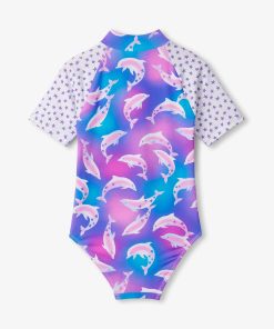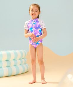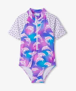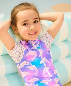 Help your little one make waves with our girls airbrush dolphins one-piece rashguard! This vibrant one-piece features a purple body with a pink and blue airbrush design, all-over pink and white dolphins with starry tails, and white short sleeves with a purple star pattern. Perfect for your little dolphin lover’s next pool party!