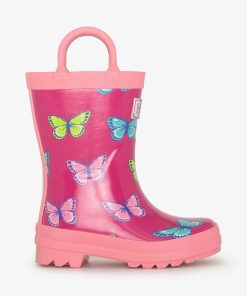 The Girls Bold Butterflies Rain Boots with Handles are as functional as they are cute! Crafted from durable rubber, these boots feature vibrant butterfly prints and easy-to-use handles for quick on-and-off. Perfect for splashing in puddles or exploring on wet days.