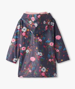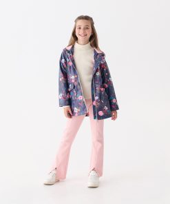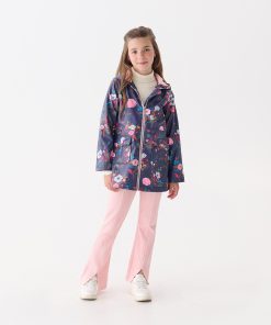 Brighten up rainy days with the Girls Fall Floral Zip-Up Rain Jacket in Blue! This waterproof, hooded jacket features a slightly flared silhouette with a cheerful all-over floral print on a dark blue base, complemented by a soft pink terry lining. With front flap pockets, pink buttons, a silvery exposed zipper, an interior storm guard, it’s the perfect blend of functional comfort and playful fall style.