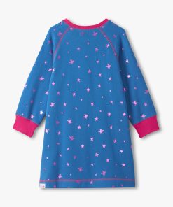 Make every day shine with the Girls Foil Stars Sweater Dress in Blue, a cozy terry cotton with an all-over metallic foil star print. Long raglan sleeves and a front kangaroo pocket keep things comfy, while fuchsia stitching and cuffs add a bold, fun finish. The relaxed fit makes it perfect for both playtime and lounging.