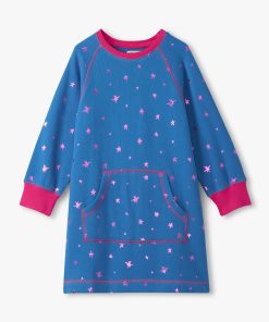 Make every day shine with the Girls Foil Stars Sweater Dress in Blue, a cozy terry cotton with an all-over metallic foil star print. Long raglan sleeves and a front kangaroo pocket keep things comfy, while fuchsia stitching and cuffs add a bold, fun finish. The relaxed fit makes it perfect for both playtime and lounging.