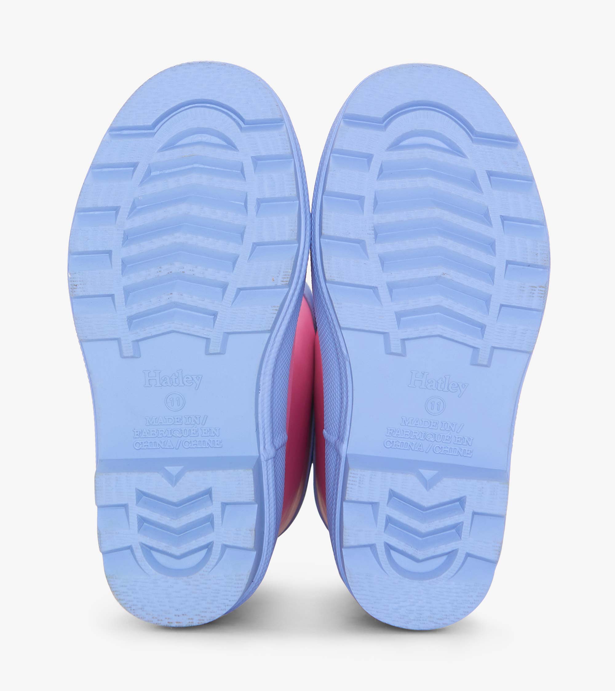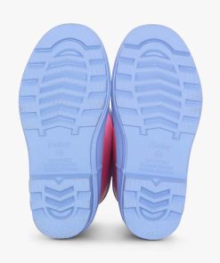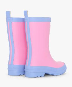 Brighten up rainy days with the Girls Fuchsia Matte Rain Boots in Pink. Crafted from handmade vulcanized rubber with a sleek matte finish, these waterproof boots are built for splashing fun. The bold pink background is accented with a periwinkle blue sole, leg opening, and pull tab, plus a double black stripe up the back for a sporty edge.