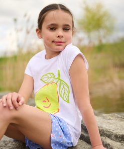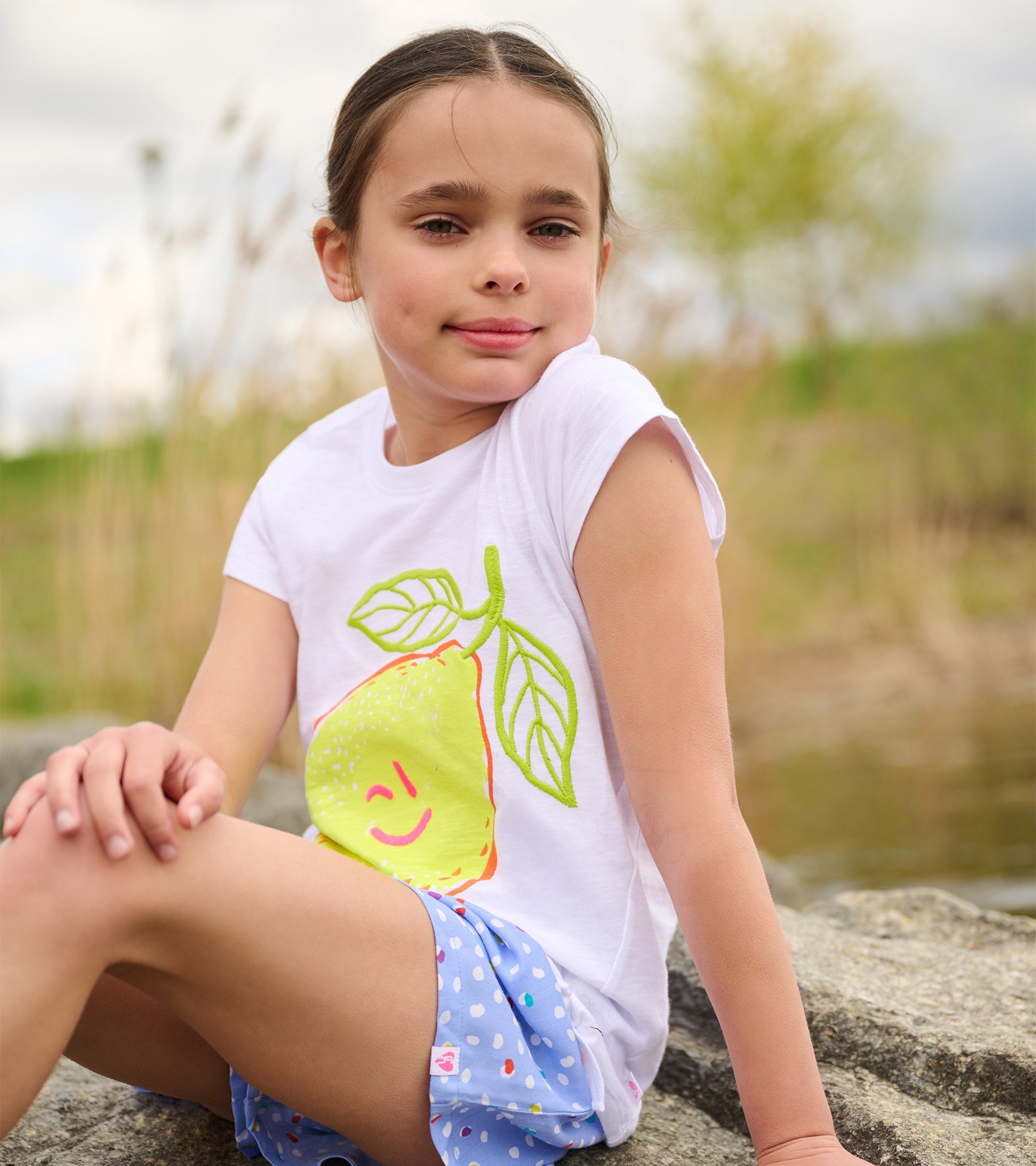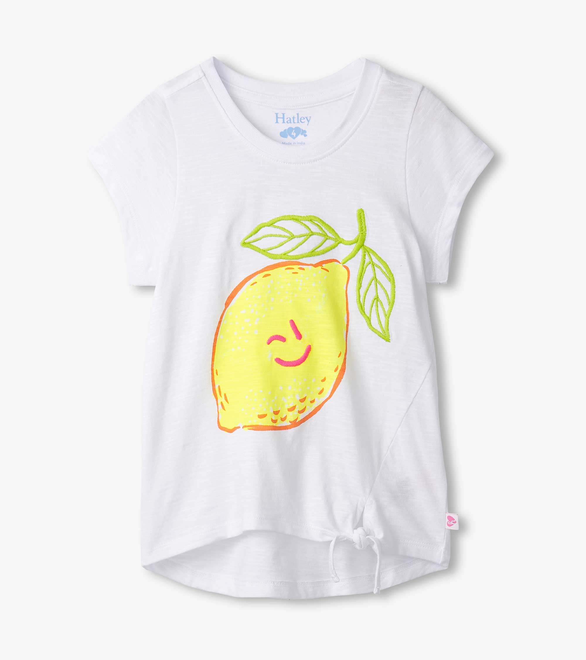 The Girls Happy Lemon Tie Front T-Shirt is as zesty as it gets! Made from soft, breathable cotton, this tee features a cheerful lemon graphic and a trendy tie-front detail. Perfect for pairing with shorts or skirts, it’s a fun, fresh pick for sunny days.