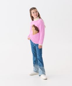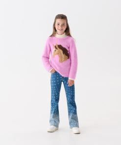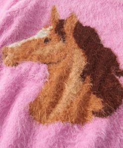 Add an ultra-soft, cozy statement to her wardrobe with the Girls Horse Furry Sweater in Pink! Knitted from a soft, fuzzy blend of nylon and acrylic, this long-sleeve fuchsia pink sweater features a large horse motif woven directly into the fabric and a classic round neckline, making it the perfect balance of comfort and warmth.