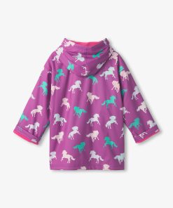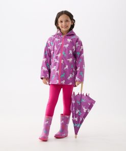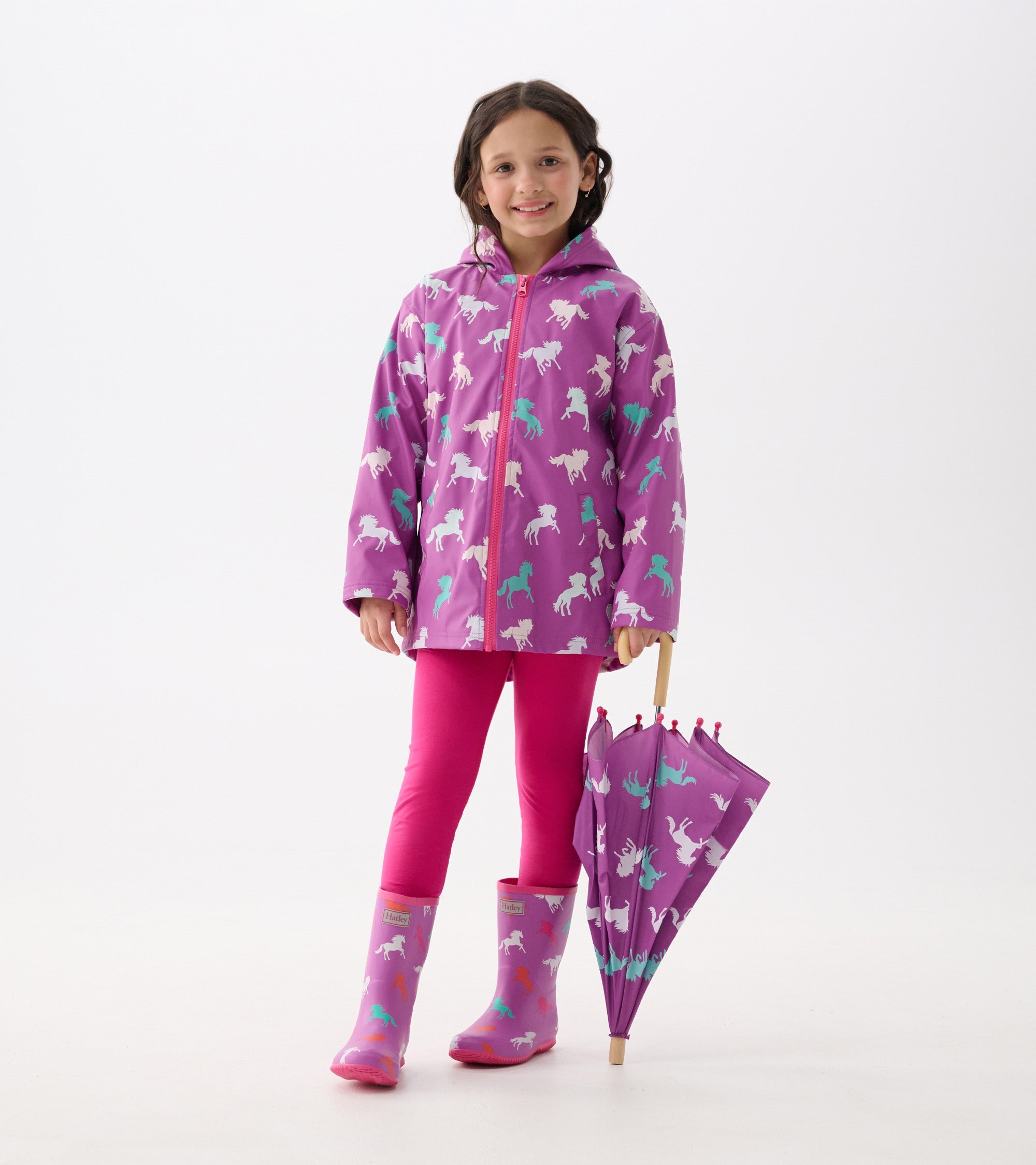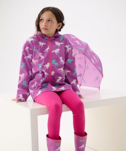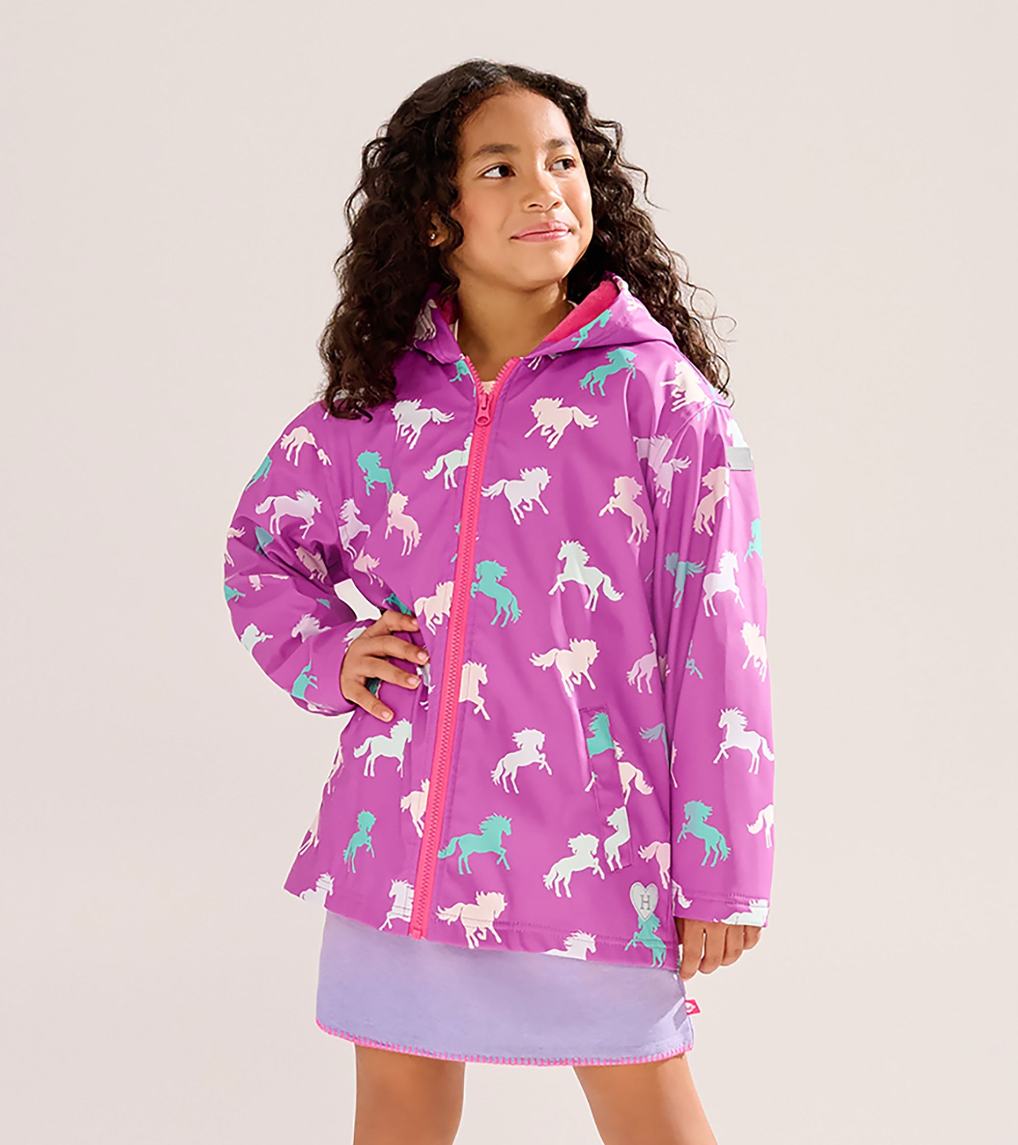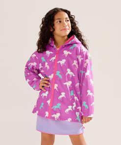 The Girls Leaping Horses Zip-Up Rain Jacket is an equestrian-inspired delight! Made from water-resistant polyester, this jacket features playful horse graphics that gallop across the design. Lightweight and easy to wear, it’s equipped with a zip-up front and hood to keep her dry on drizzly days. Ideal for girls who love adventure and style.