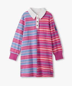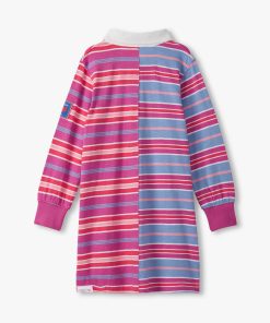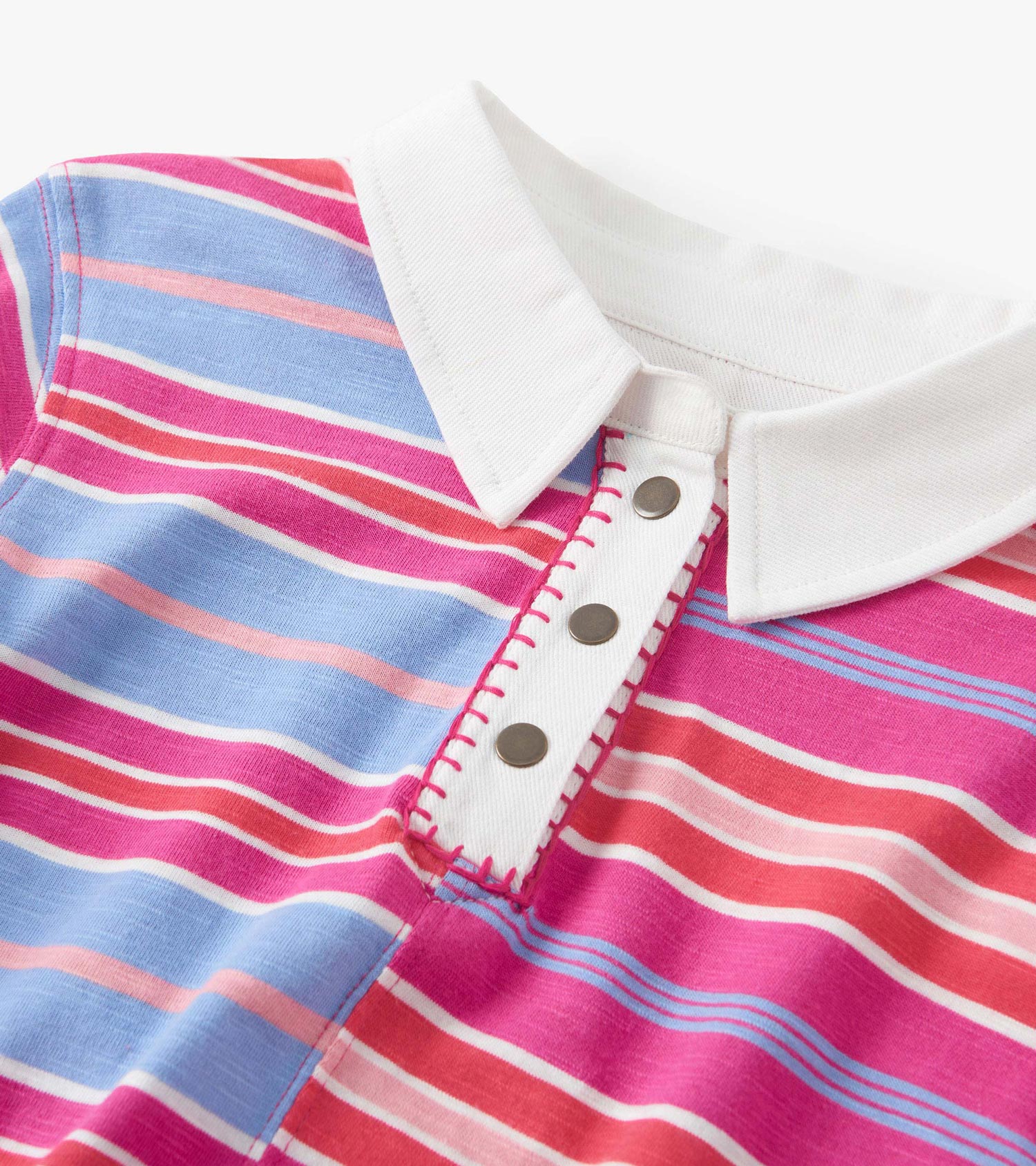 The Girls Mixed Stripes Polo Dress in Pink is a sporty-meets-playful take on the classic rugby look, made from soft 100% cotton slub jersey. With long sleeves, a crisp white woven collar, and three dark grey snap buttons accented by dark pink blanket stitching, it blends polished detail with fun design. The eye-catching colour-block stripe layout, blue dominant on the right, purple on the left, adds visual flair, while dark pink, white, and purple stripes complete the vibrant mix. Finished with elastic cuffed wrists and side hem splits, this dress is made for bold standout style.