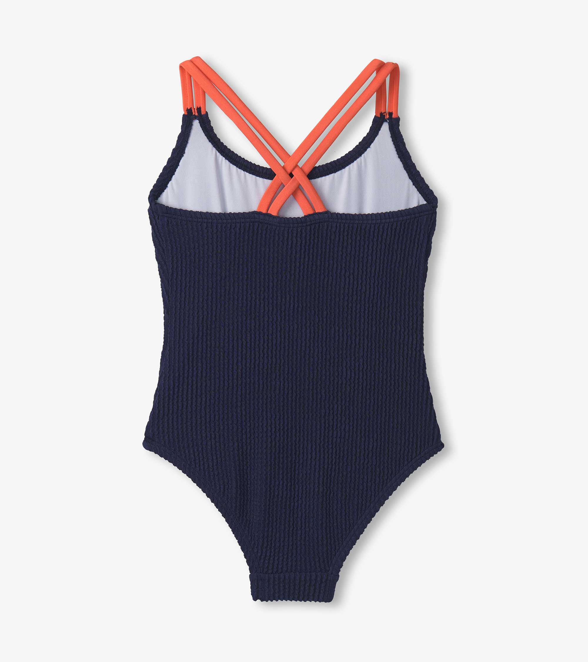 The Girls Patriot Blue Cross Strap Swimsuit is where sporty meets sweet! With a chic cross-back design and durable fabric, it’s built for active swim fun and sunny days. Perfect for your little water lover.