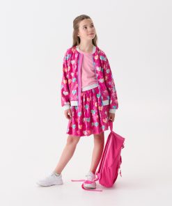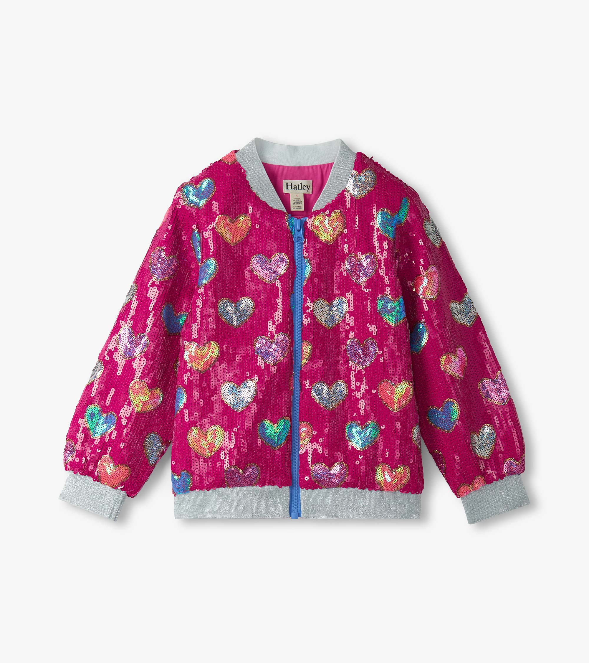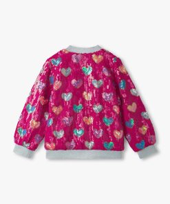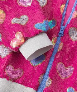 Glitz and glam come together in the Girls Pink Busted Hearts Sequin Bomber Jacket in Pink, covered in sequins and multicoloured hearts outlined in gold. A soft pink satin lining and shiny silver elastic trim add comfort and flair, while the blue exposed zipper adds a fun contrast to this show-stopping layer.