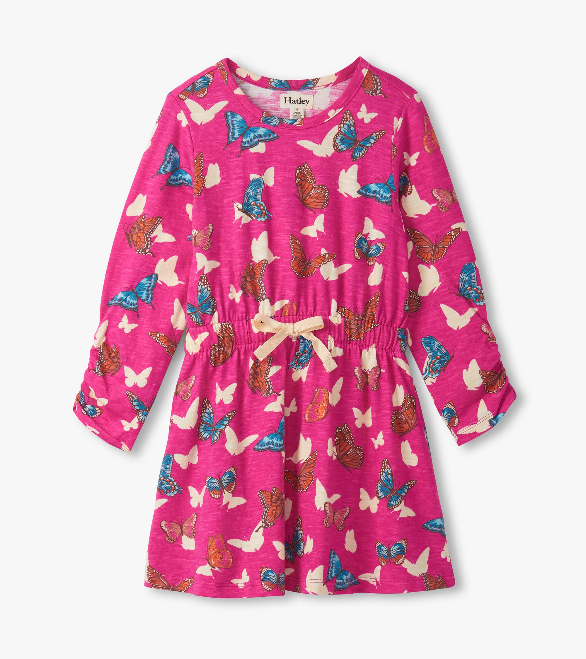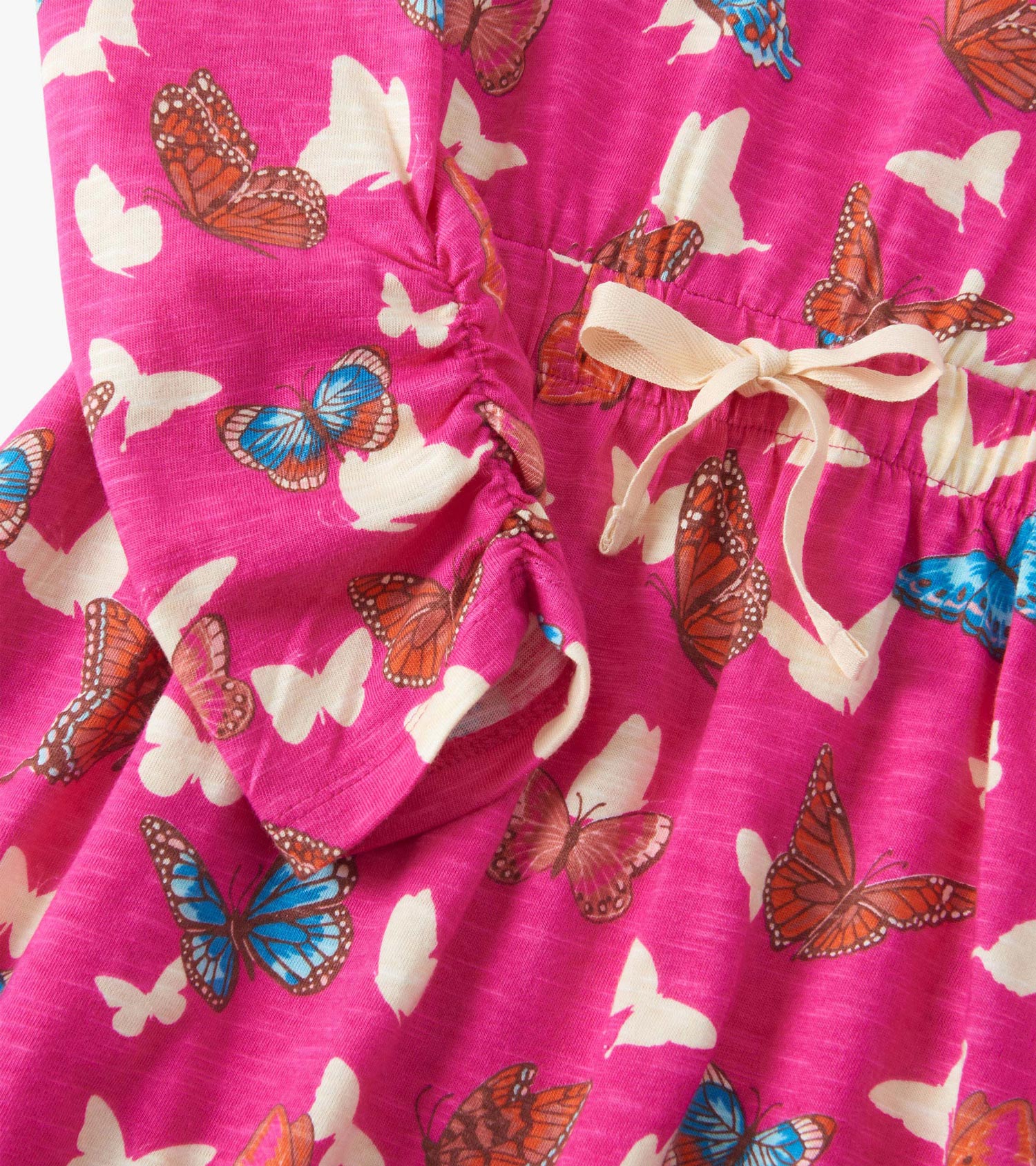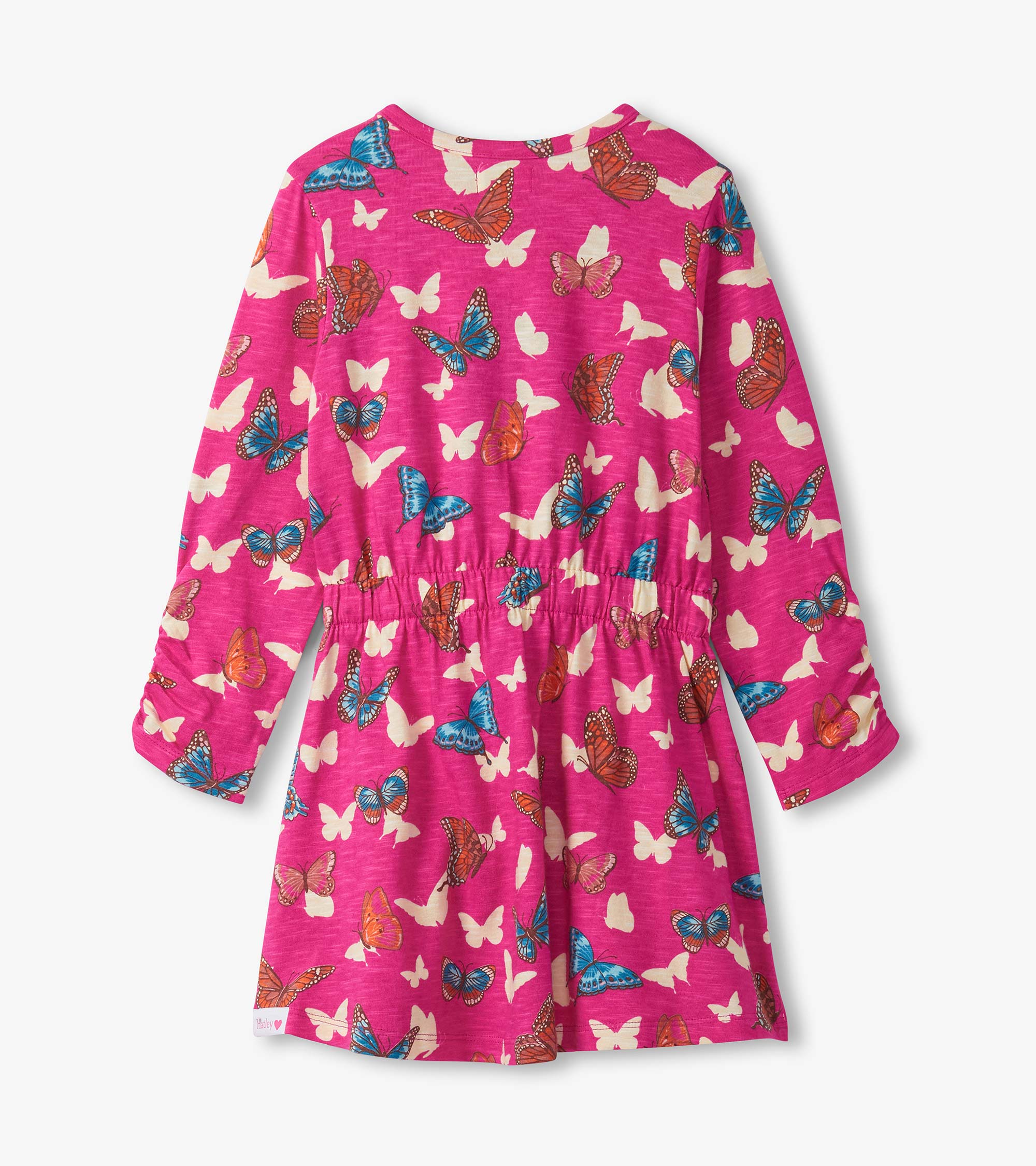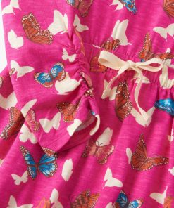 The Girls Pop Out Butterflies Cinched Waist Dress in Pink is a soft and breathable 100% cotton slub jersey piece that’s as fun as it is functional. Set against a rich dark pink background, the dress features an all-over flutter of white butterfly silhouettes and colourful orange and blue detailed butterflies. With long sleeves finished in delicate ruching, a comfy elastic cinched waist, and a functional white drawcord for the perfect fit, it’s a playful go-to.