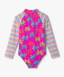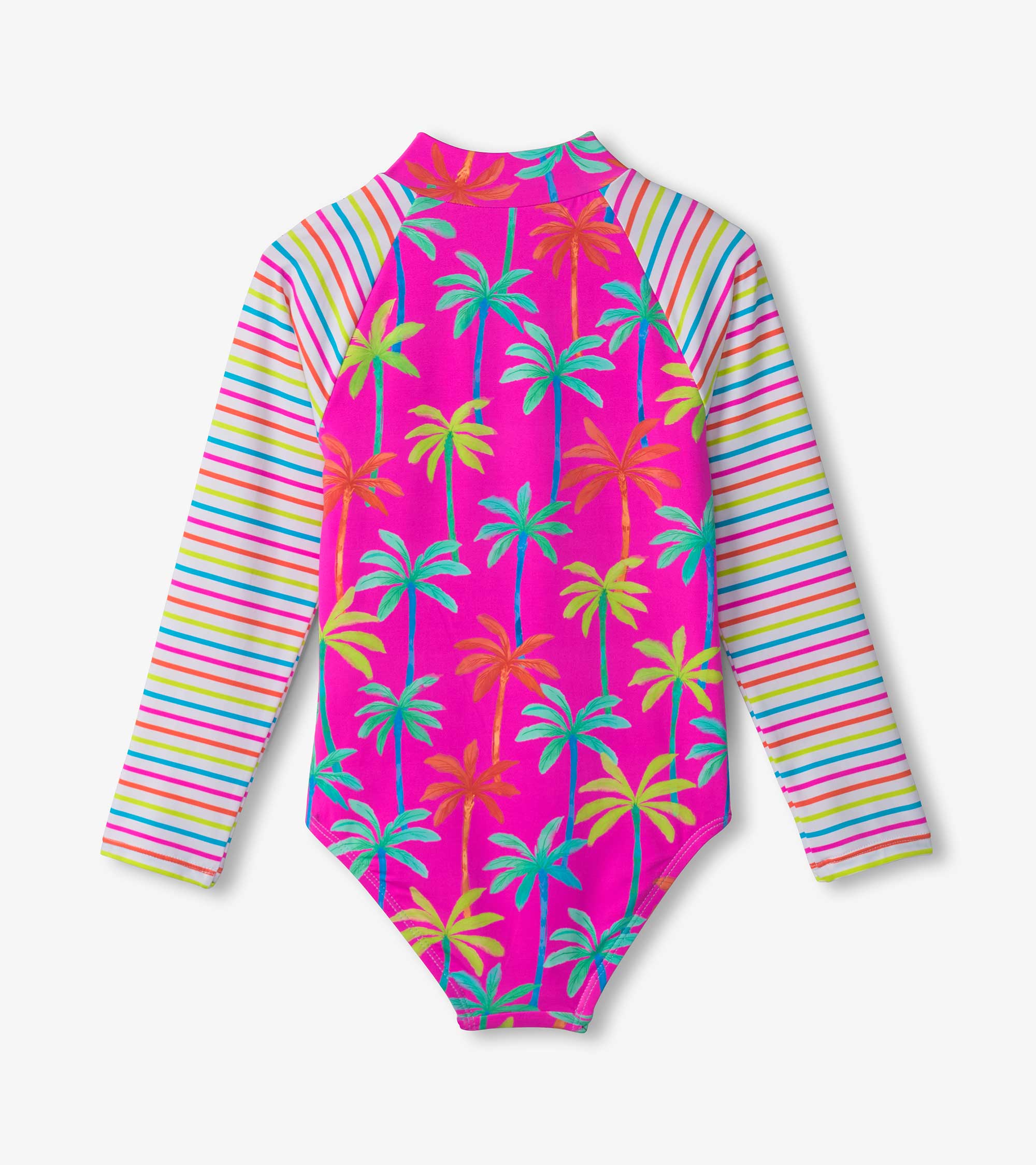 Let your little one channel paradise in our girls printed palms long sleeve rashguard swimsuit! This striking swimsuit features a fuchsia purple body, white arms with multicolor stripes, and an all-over multi-color palm tree design. Perfect for their next day at the splash pad!