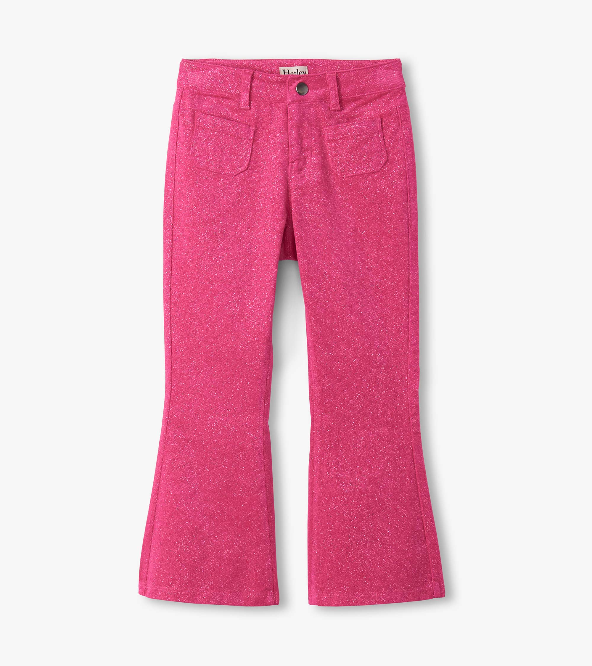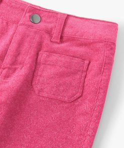 The Girls Raspberry Rose Patch Pocket Flared Pants in Pink bring retro flair and modern sparkle to her wardrobe. Made from stretch glitter corduroy, these pants shimmer with every move while offering a comfortable, flexible fit. Featuring a flattering flared leg, front patch pockets, and a functional zipper fly with snap closure, they’re as practical as they are stylish. The adjustable internal waistband and belt loops ensure a custom fit that grows with her. In a vibrant pink hue dusted with glitter, these pants are made to stand out and shine.
