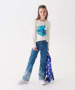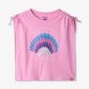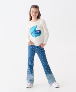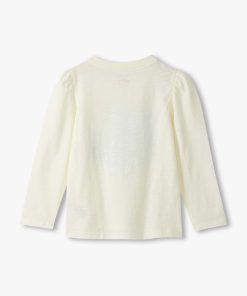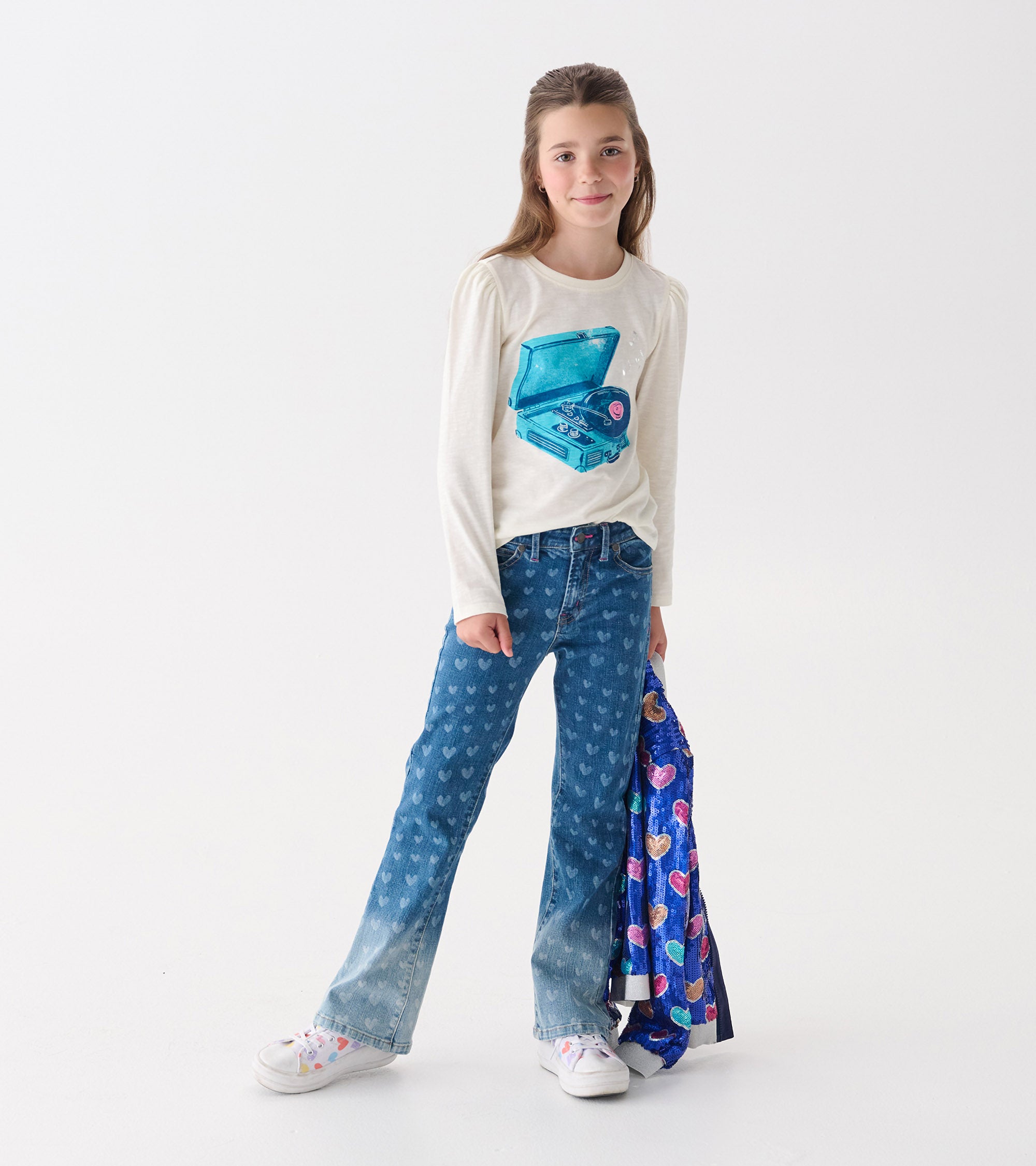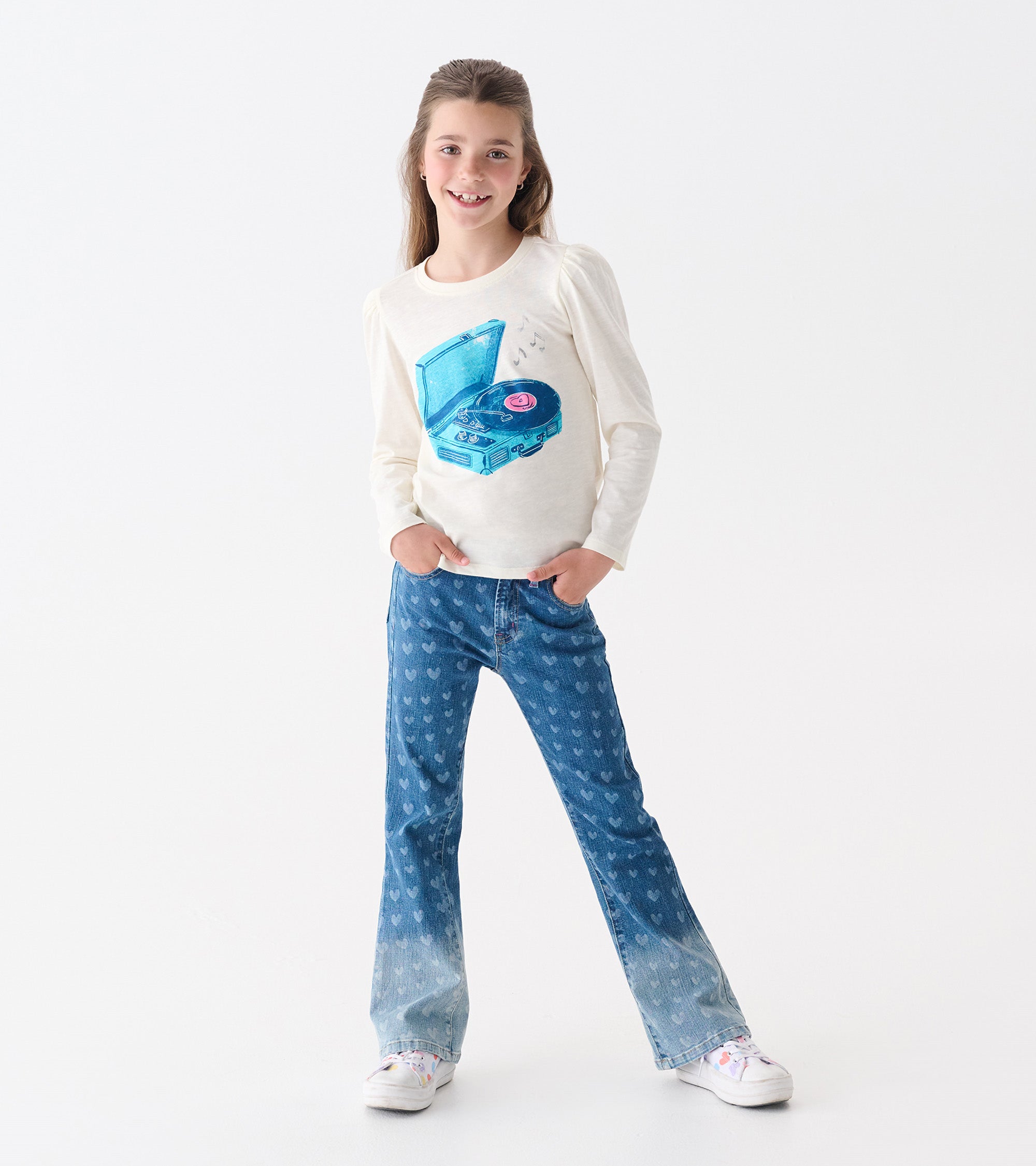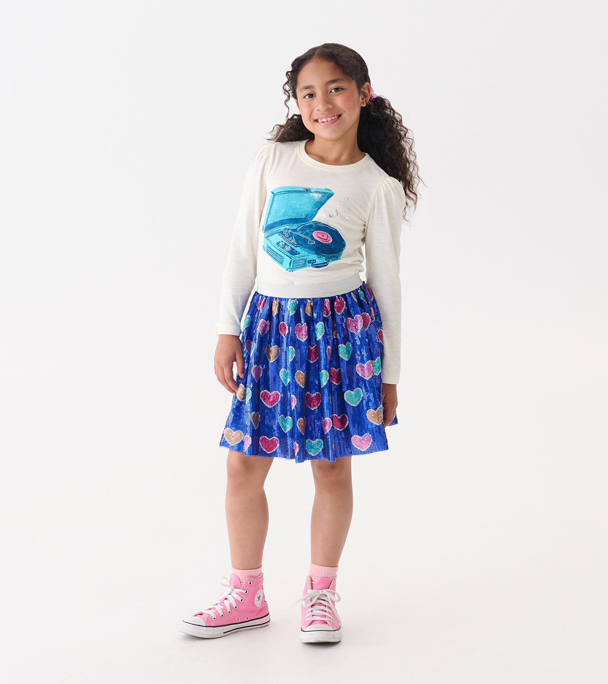 The Girls Record Player Puff Sleeve Graphic Tee in Natural hits all the right notes of retro charm and playful style. Made from soft, breathable 100% cotton drapey slub jersey, it features a round neckline and statement puff sleeves that gather delicately at the shoulders. A vintage-style blue portable vinyl player with a pink heart at the center takes center stage, while shiny silver musical notes dance across the natural-toned fabric, bringing a whimsical, feel-good vibe to any outfit.