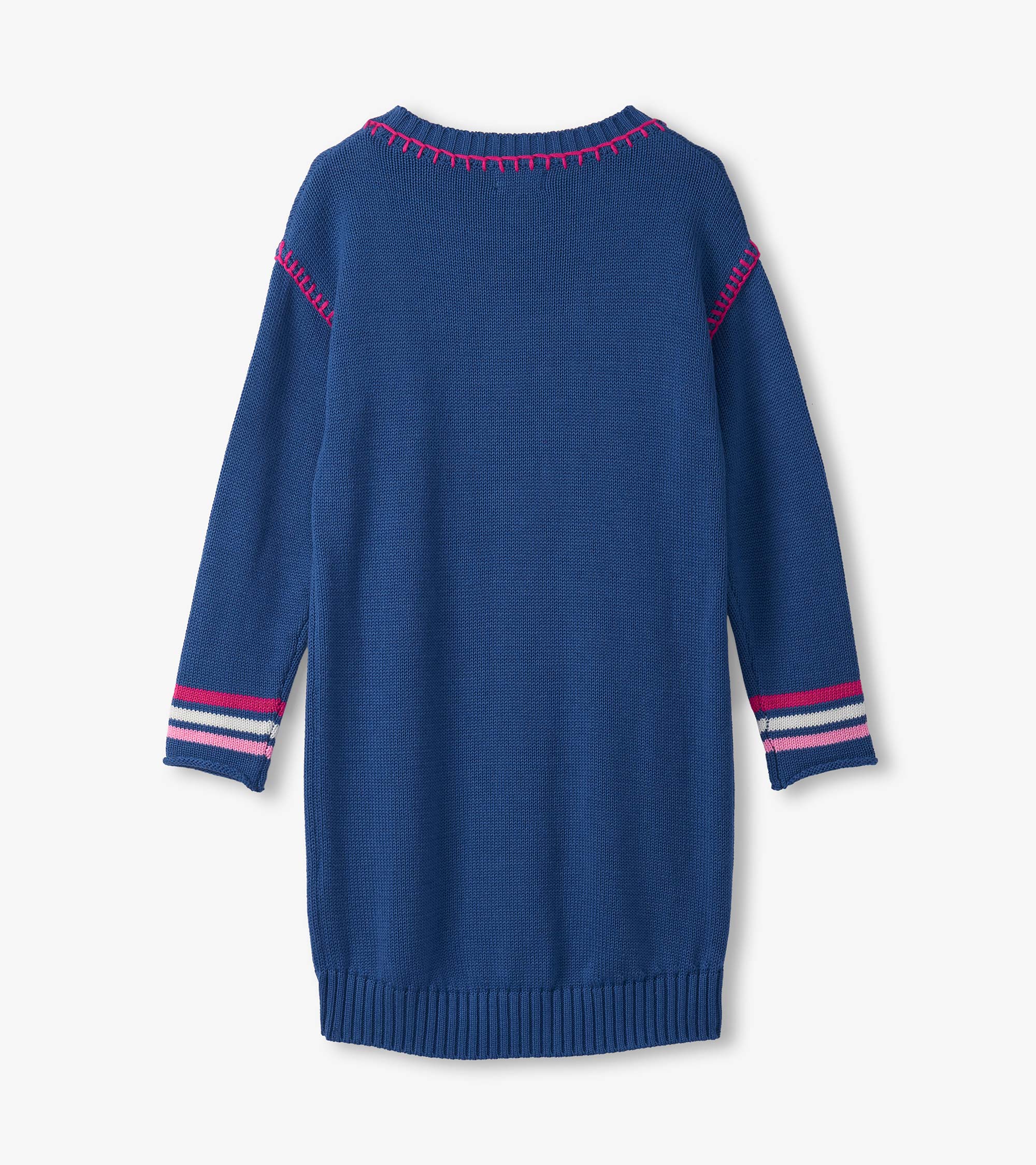 The Girls Sapphire Drop Shoulder Sweater Dress in Blue is a soft, lightweight knit crafted from a cozy cotton-viscose blend designed for all-day comfort and movement. With a relaxed drop-shoulder silhouette and a longer back hem, this dress offers a modern, easygoing fit. A bold dark pink heart stitched at the chest and decorative pink blanket stitching around the neckline and armholes add playful charm, while the striped cuffs in pink, white, and dark pink complete the look with a sweet, sporty touch.