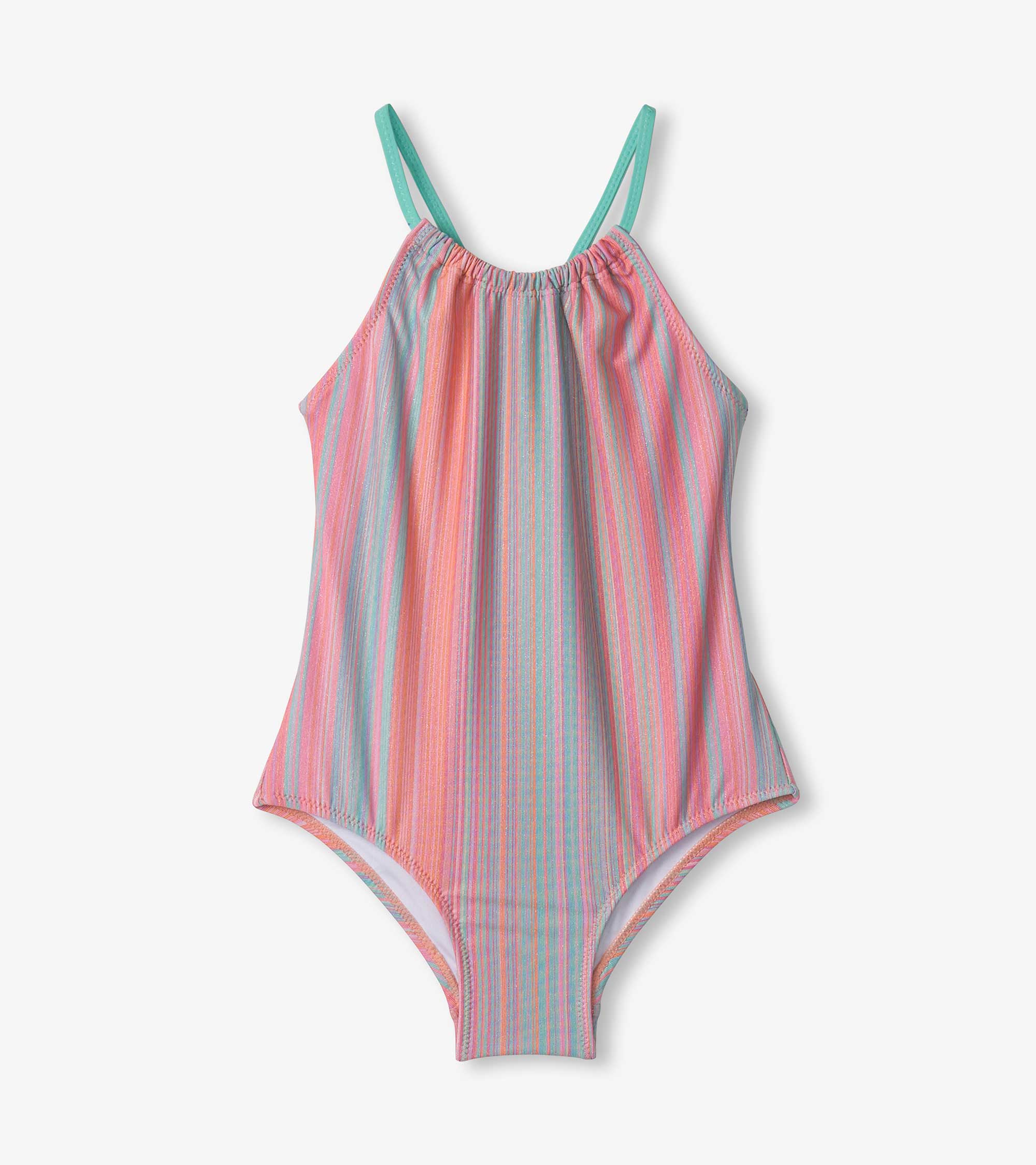 Help your little one glow with our girls shimmer stripe gather front swimsuit! This eye-catching one-piece features shimmering turquoise and pink stripes, a gathered front, and turquoise criss cross back straps. Perfect for helping them make a shining impression at the beach or pool!