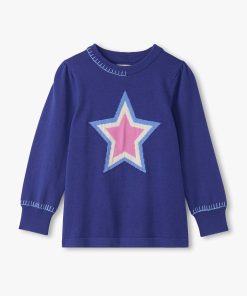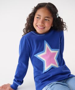 The Girls Super Star Pullover Sweater in Blue is a cozy showstopper made for cooler days and starry vibes. Crafted from 100% cotton yarn, this tunic-length sweater offers softness and warmth with a round neckline and full-length sleeves. Against its dark blue backdrop, a large pink star takes center stage on the chest, radiating with white and light blue knitted outlines. Decorative light blue blanket stitching adds artisanal charm around the neck and wrists, making this pullover a stellar pick for comfort with standout style.