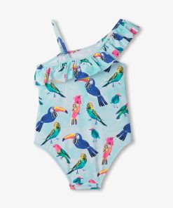 Help your little one fly high with our girls tropical birds ruffle trim swimsuit! This vibrant one-piece features an aqua color with a cloudy texture, a multi-color all-over tropical bird design outlined in white, and ruffle trim on the front and back over the right spaghetti strap. Perfect for your family’s next tropical getaway!