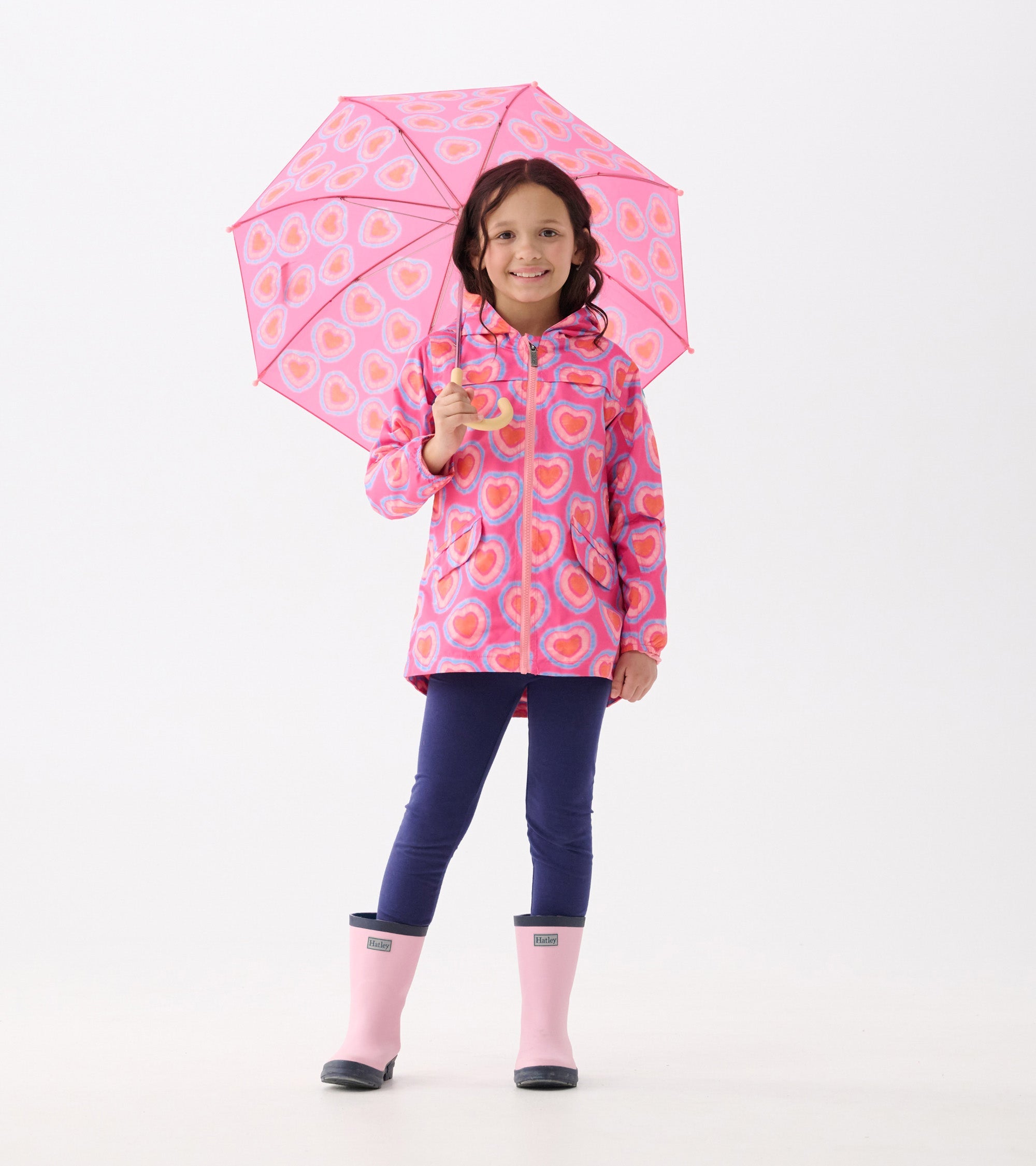 Keep her dry and stylish with the Kids Glowing Hearts Umbrella! This lightweight polyester umbrella features a glowing heart design that’s sure to brighten up any rainy day. Its sturdy frame and easy-to-hold handle make it perfect for little hands. A practical and fun accessory for weathering the storm!