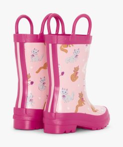 Brighten up rainy days with the Toddler Girls Little Kitties Rain Boots in Pink! These handmade vulcanized rubber boots combine waterproof protection with playful charm, featuring an all-over print of white, grey, and brown kittens adorned with fuchsia ribbons, sprinkled with tiny white hearts on a light pink background. A glossy finish adds shine, while the slip-resistant fuchsia sole and matching striped accents along the back, rim, and boot loops offer both flair and function. Finished with a white-and-fuchsia box logo on the front and a removable insole for added comfort, these boots keep little feet dry and adorable in every puddle adventure.
