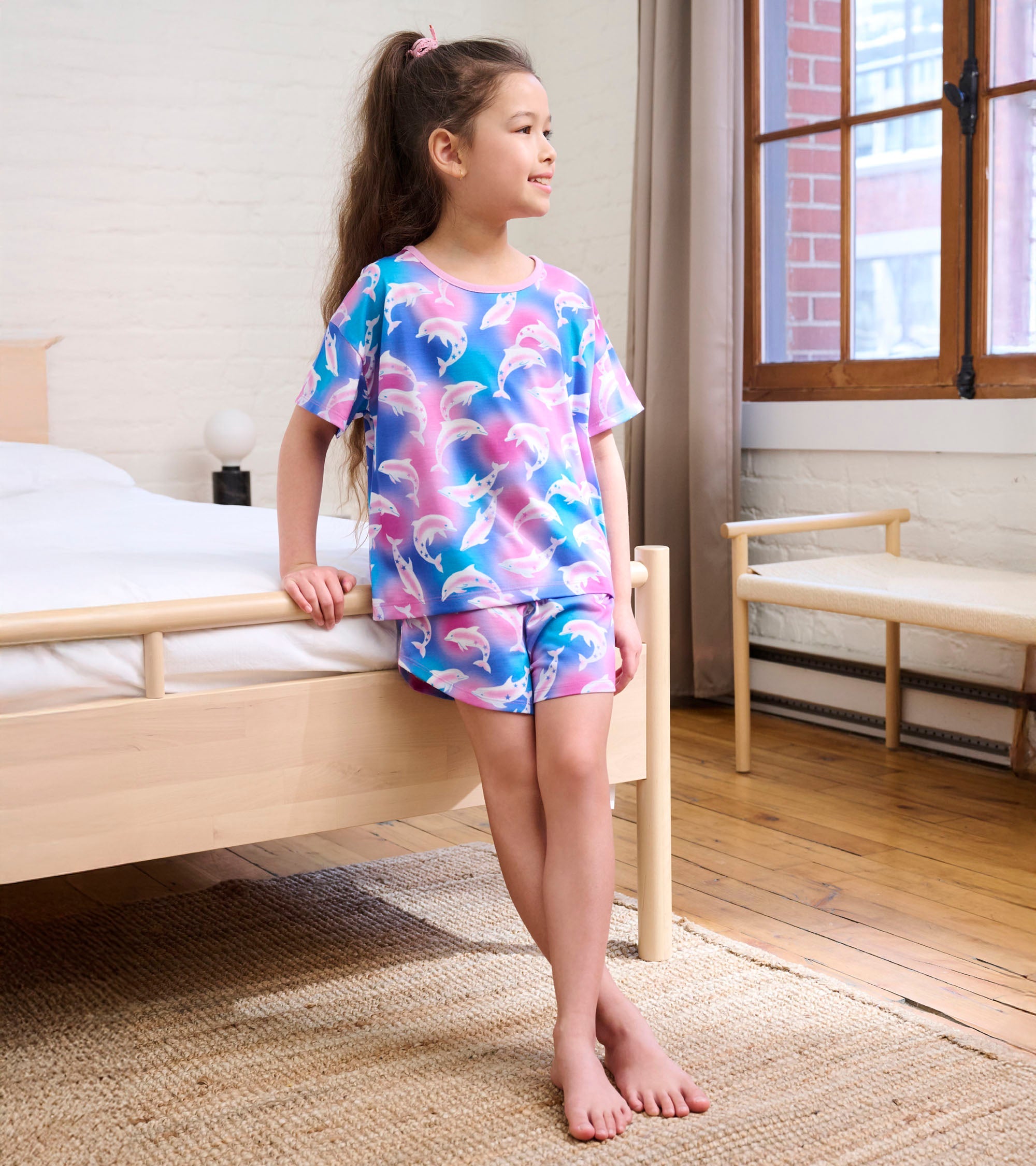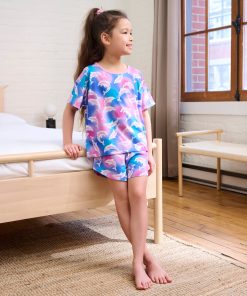 Let her dream of the ocean with the Girls Airbrush Dolphins Tee and Shorts Pajama Set! This comfy polyester set includes a short-sleeve tee with a serene dolphin print and matching shorts. Lightweight and breathable, it’s perfect for warm nights or laid-back lounging.