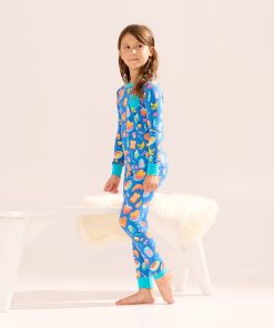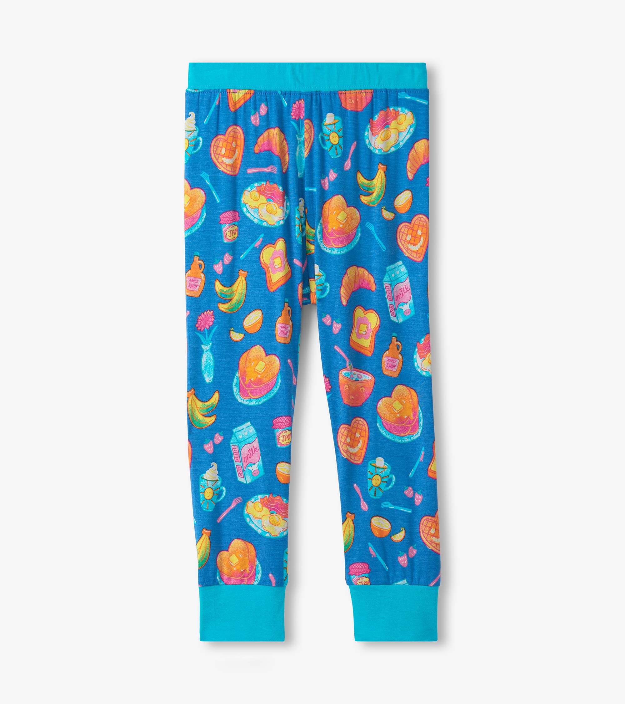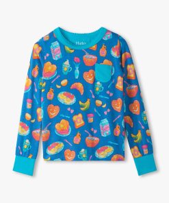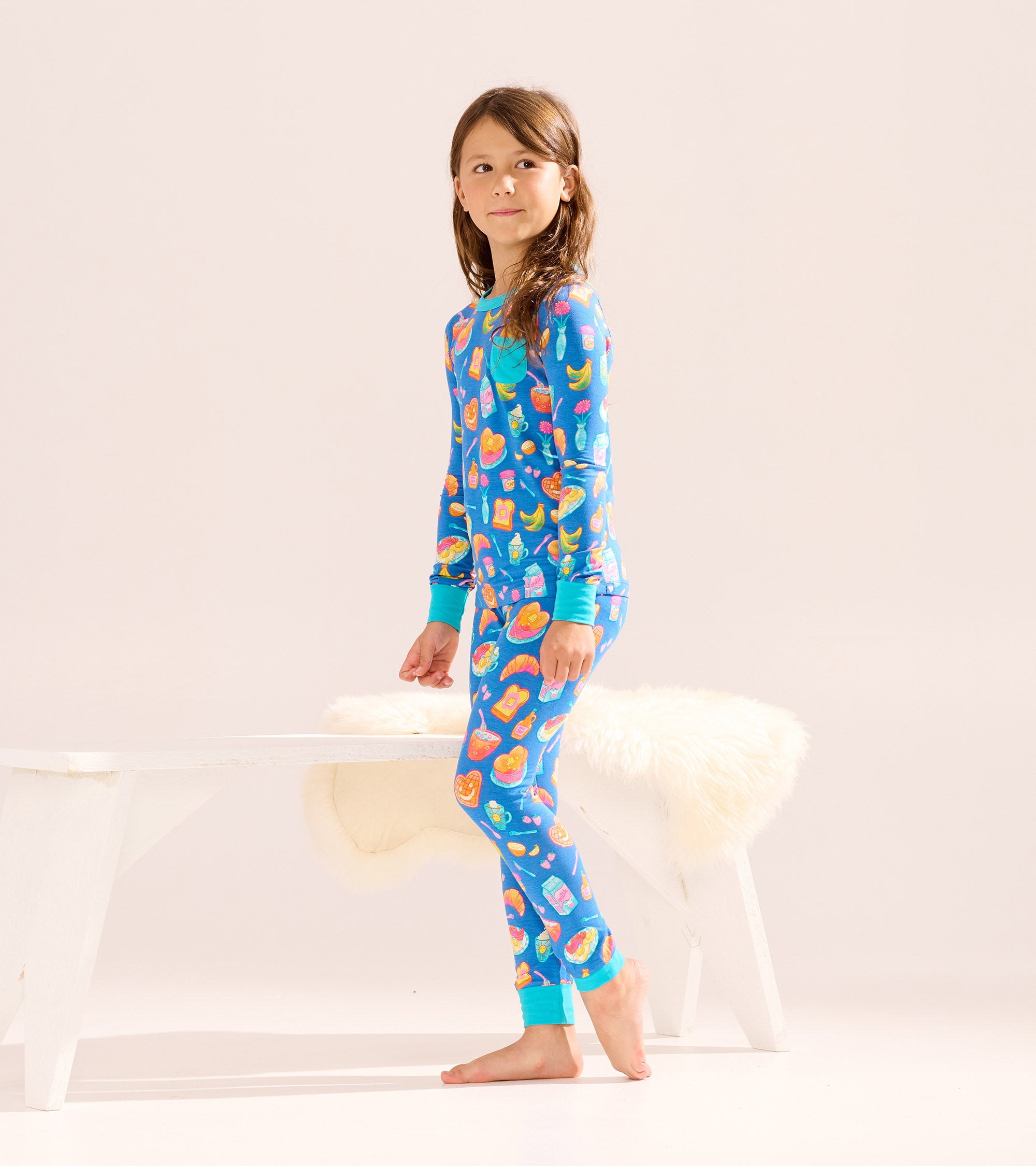 Start every morning with a smile in the Girls Breakfast Bamboo Pajama Set in Blue! Crafted from buttery-soft bamboo with just the right amount of stretch, this cozy two-piece features a deep blue base playfully patterned with colourful breakfast favourites. Light blue trim at the crewneck, cuffs, and waistband adds a sweet touch, while charming details like a chest patch pocket and delicate picot stitching complete the look. And for the perfect matching moment, this style comes in a coordinating women’s set, making it a delightful Mommy n’ Me option for sweet dreams and snuggly mornings.