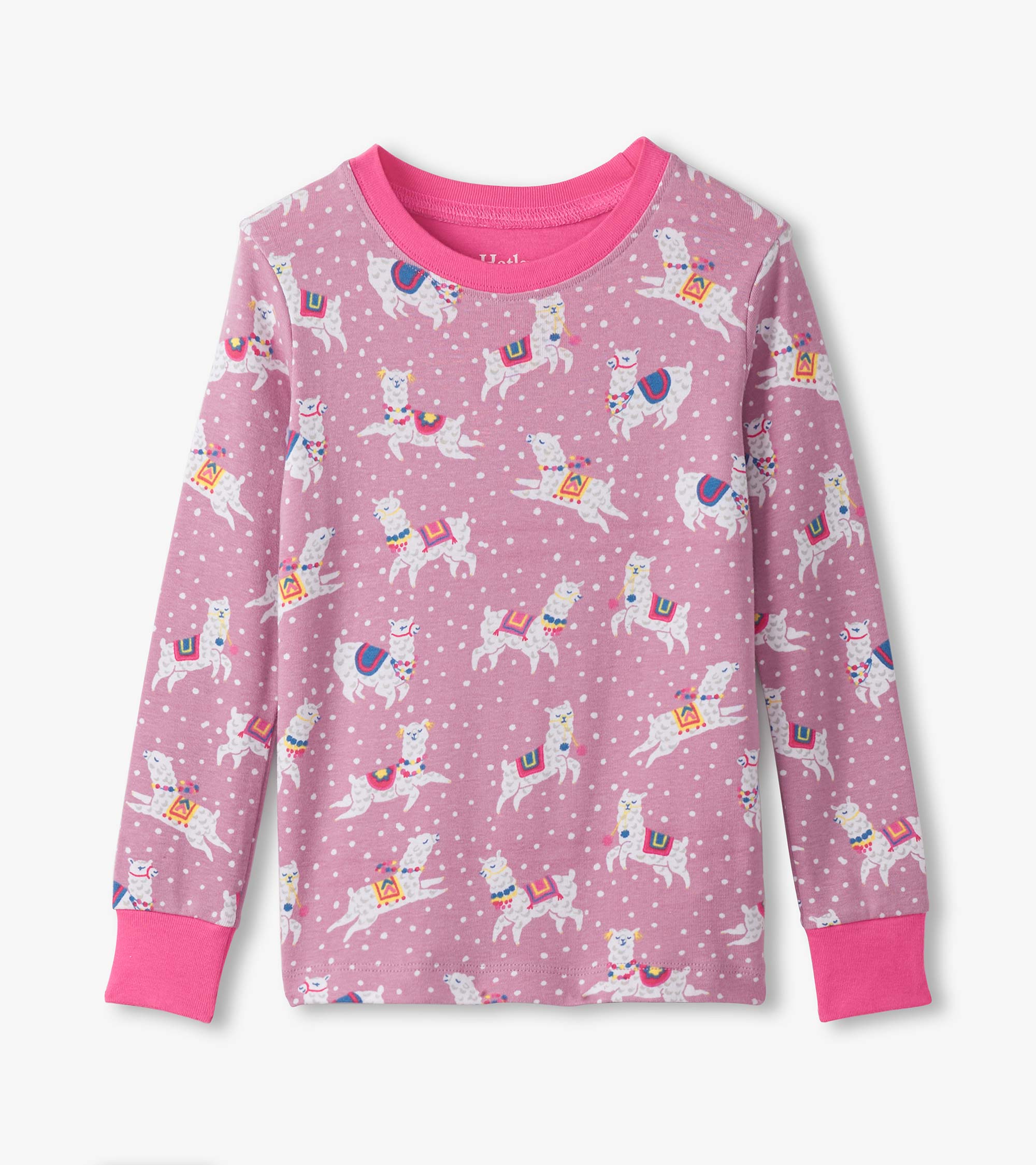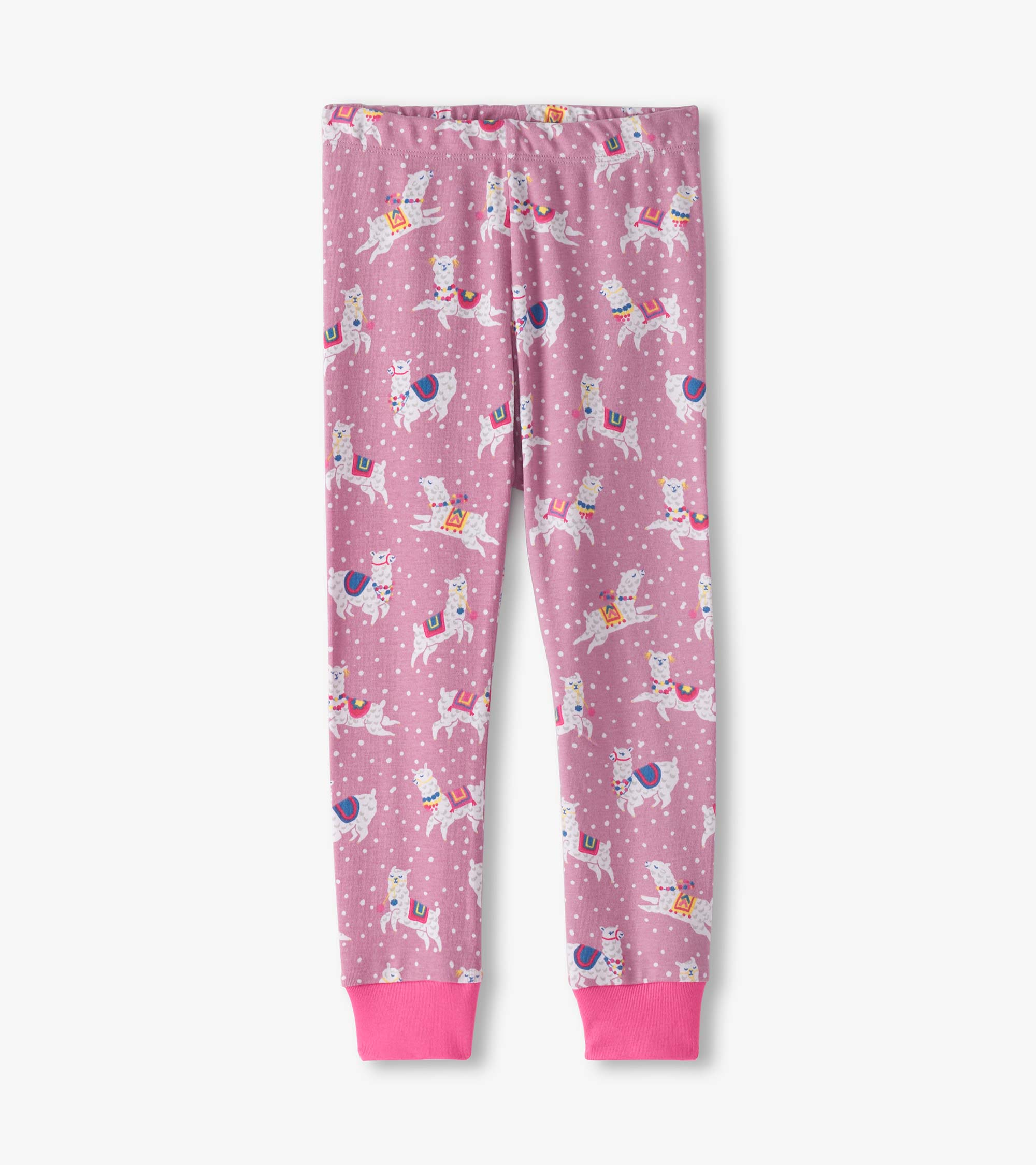 The Girls Dancing Alpacas Cotton Pajama Set is a snug-fitting two-piece crafted from soft 100% cotton, designed to keep her comfy all night long. Set against a dark fuchsia pink backdrop with an all-over white dot print, this playful set features dancing alpacas dressed in multicoloured necklaces and rugs for a whimsical bedtime look. Bright pink trim at the neckline, cuffs, and ankles adds a cheerful pop of contrast, while the elastic waistband ensures a secure, flexible fit.